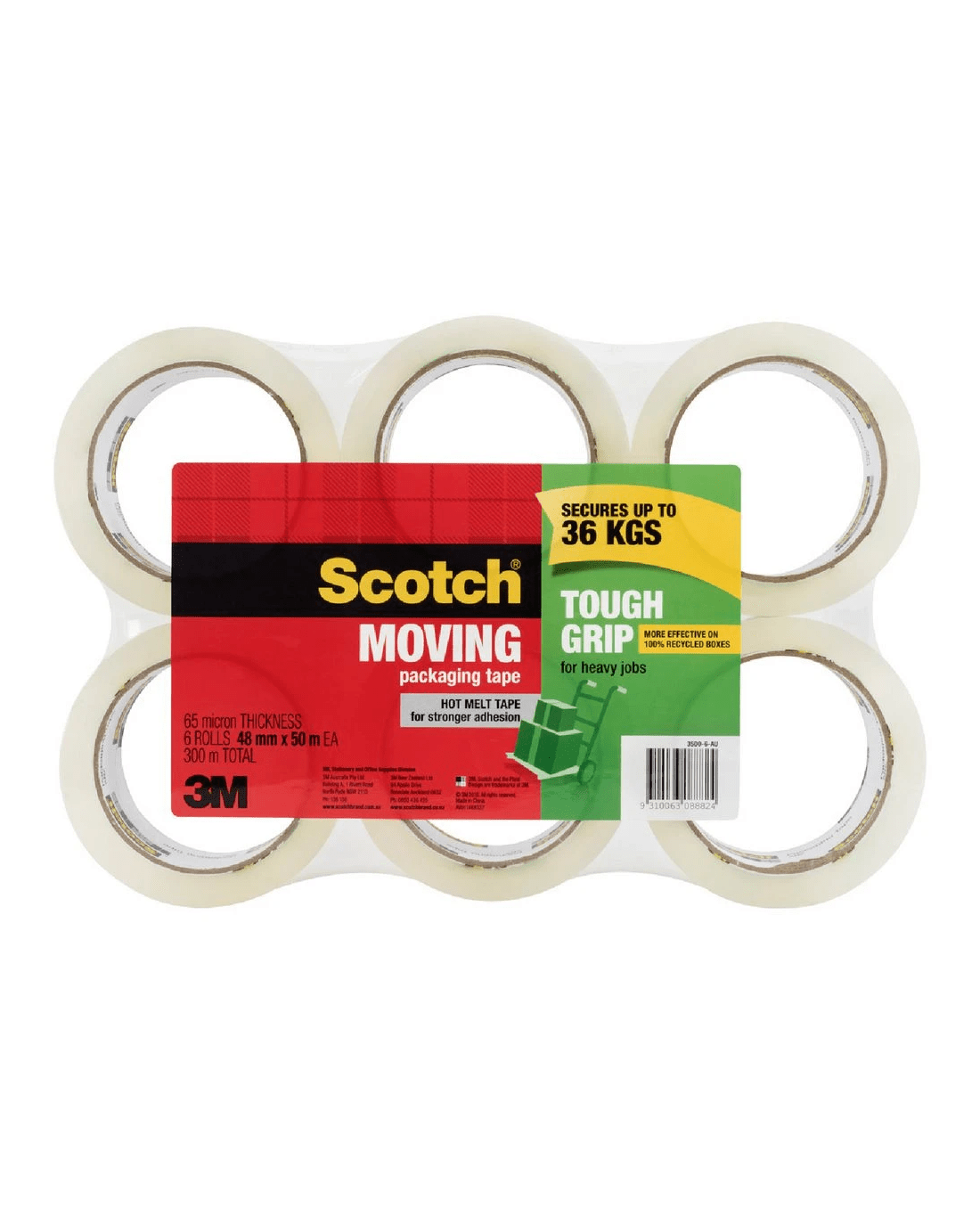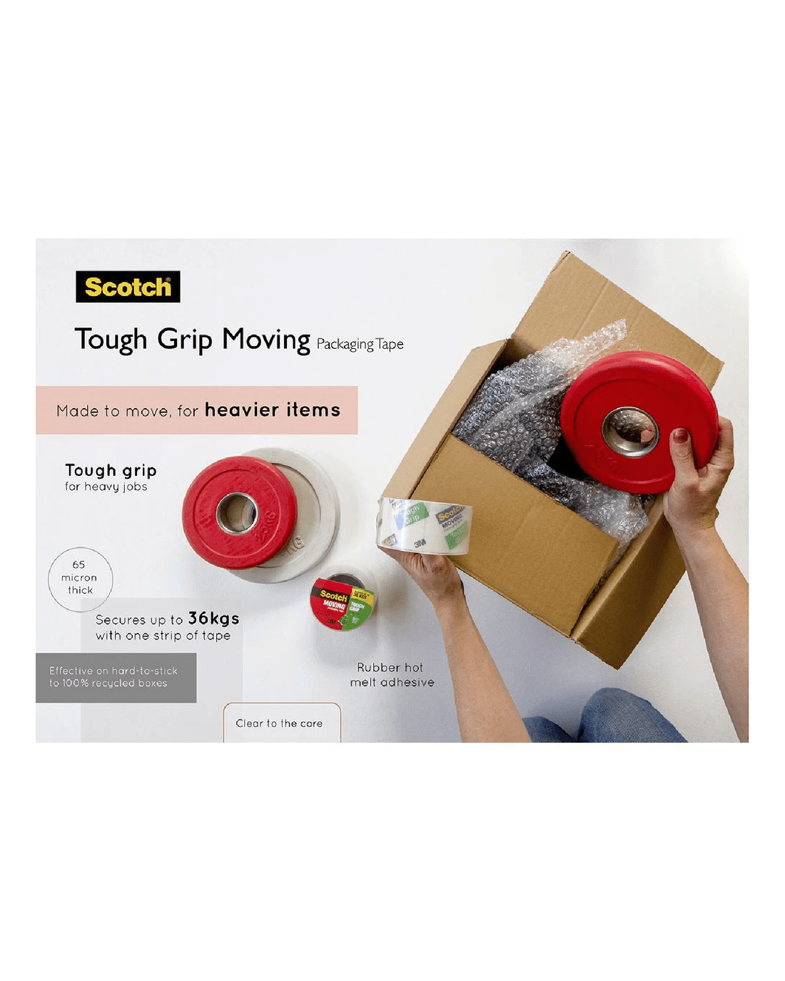 This Scotch Moving Tape is designed to seal heavy boxes weighing up to 36 kg making it ideal for when you're transporting packages or moving house. It utilises a strong rubber hot melt adhesive to ensure that your boxes stay sealed.