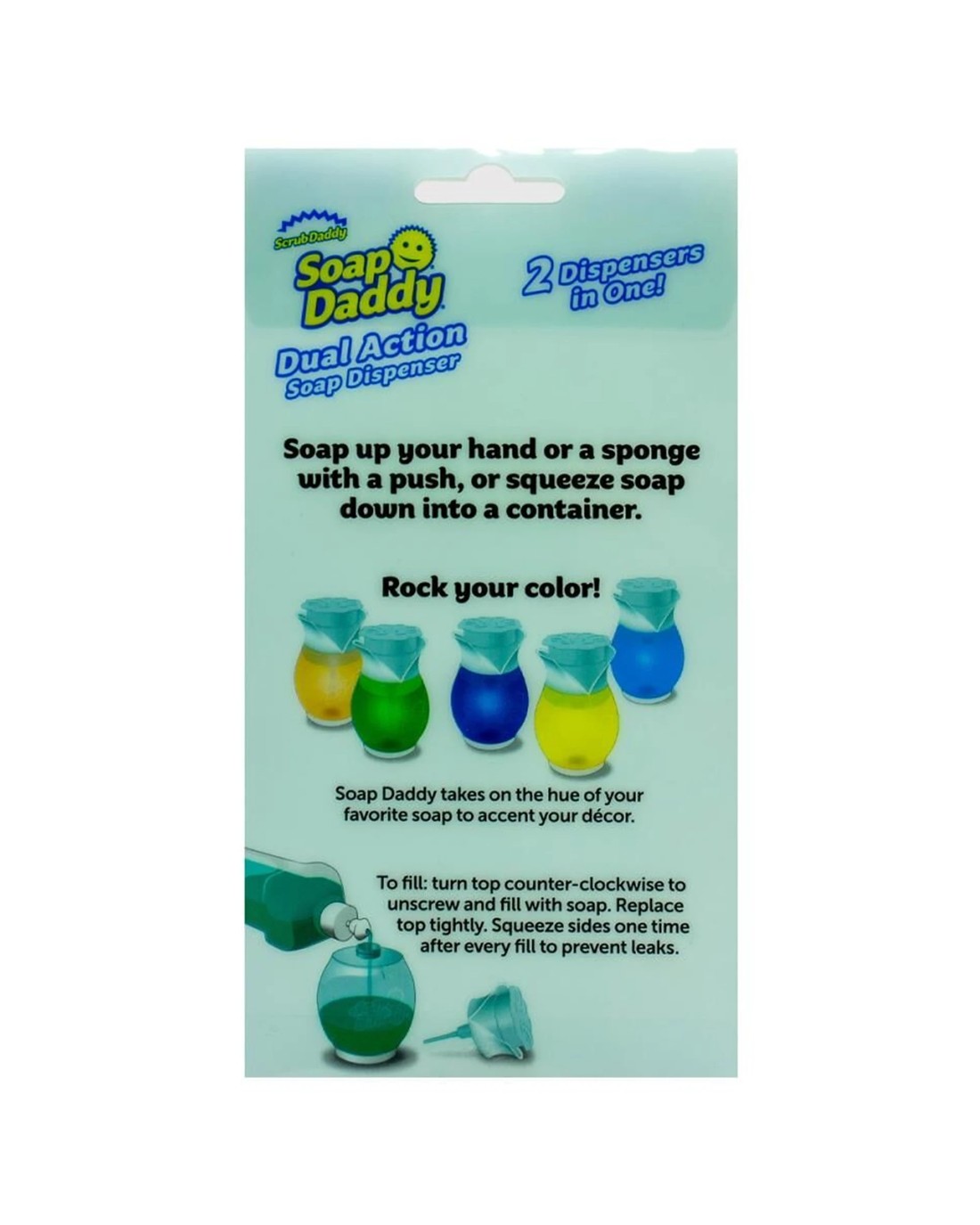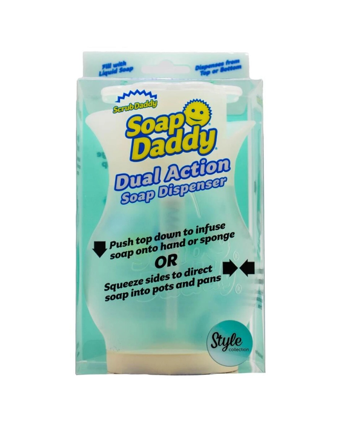 The Scrub Daddy brand presents the Soap Daddy Dual Action Soap Dispenser, designed for versatile and convenient soap dispensing in your home. This refillable dispenser offers two easy ways to apply soap, making cleaning tasks more efficient and less messy.