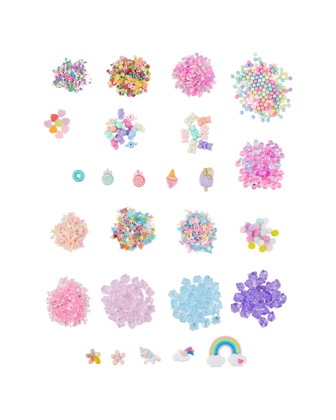 - Sweets Sensory Mix-Ins Kit: 1 x bag of candy beads, 1 x bag of bear beads, 1 x bag of round beads, 1 x bag of heart beads, 2 x bags of clay sprinkles, 1 x bag of gems, 1 x bag of small beads and 5 x charms