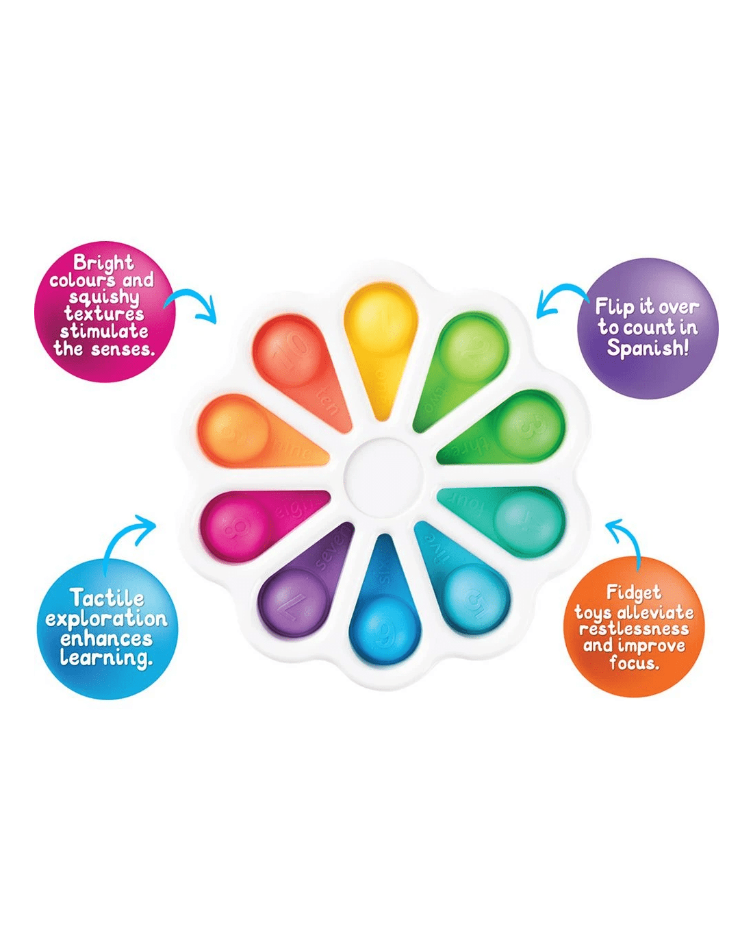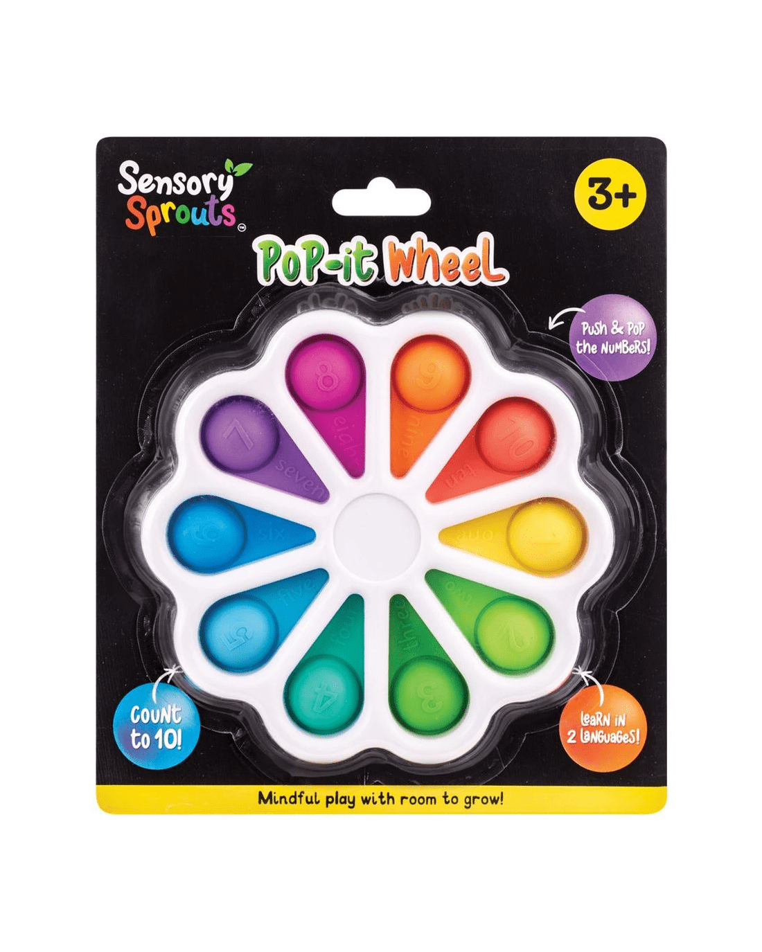 This Sensory Sprouts Pop-It Wheel is a colourful, flower shaped fidget toy that features popping bubbles with English numbers on one side and Spanish on the other. It's great for making learning bilingual numbers interactive and exciting. Plus, it's perfect for little fingers to press, pop and count and is a fantastic tool for early learning, sensory exploration and stress relief.