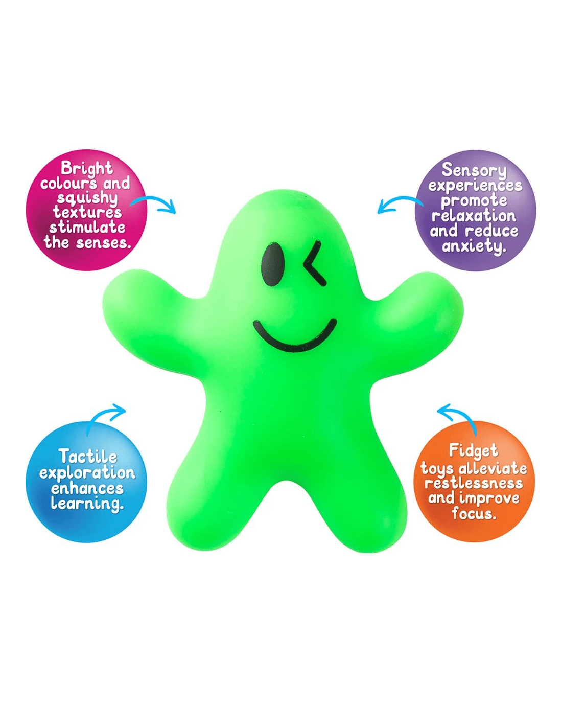 This Sensory Squish Pal is the ultimate squishy, stretchy and smiley companion, designed for endless fidget fun. It's made from a soft, durable material that helps relive stress, enhance focus and bring sensory joy to kids and adults alike. Plus, whether you stretch it, squeeze it or squish it, it bounces right back with a winking smile making it perfect for classrooms, therapy sessions or just everyday play.