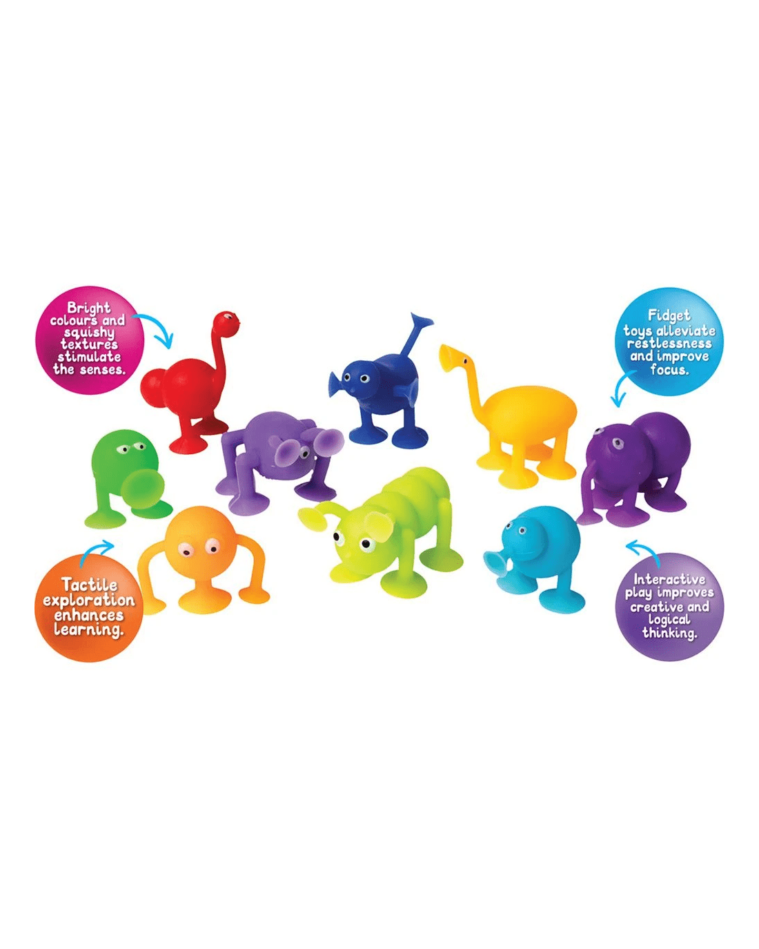 - This set contains 9 x Sensory Suction Monsters.