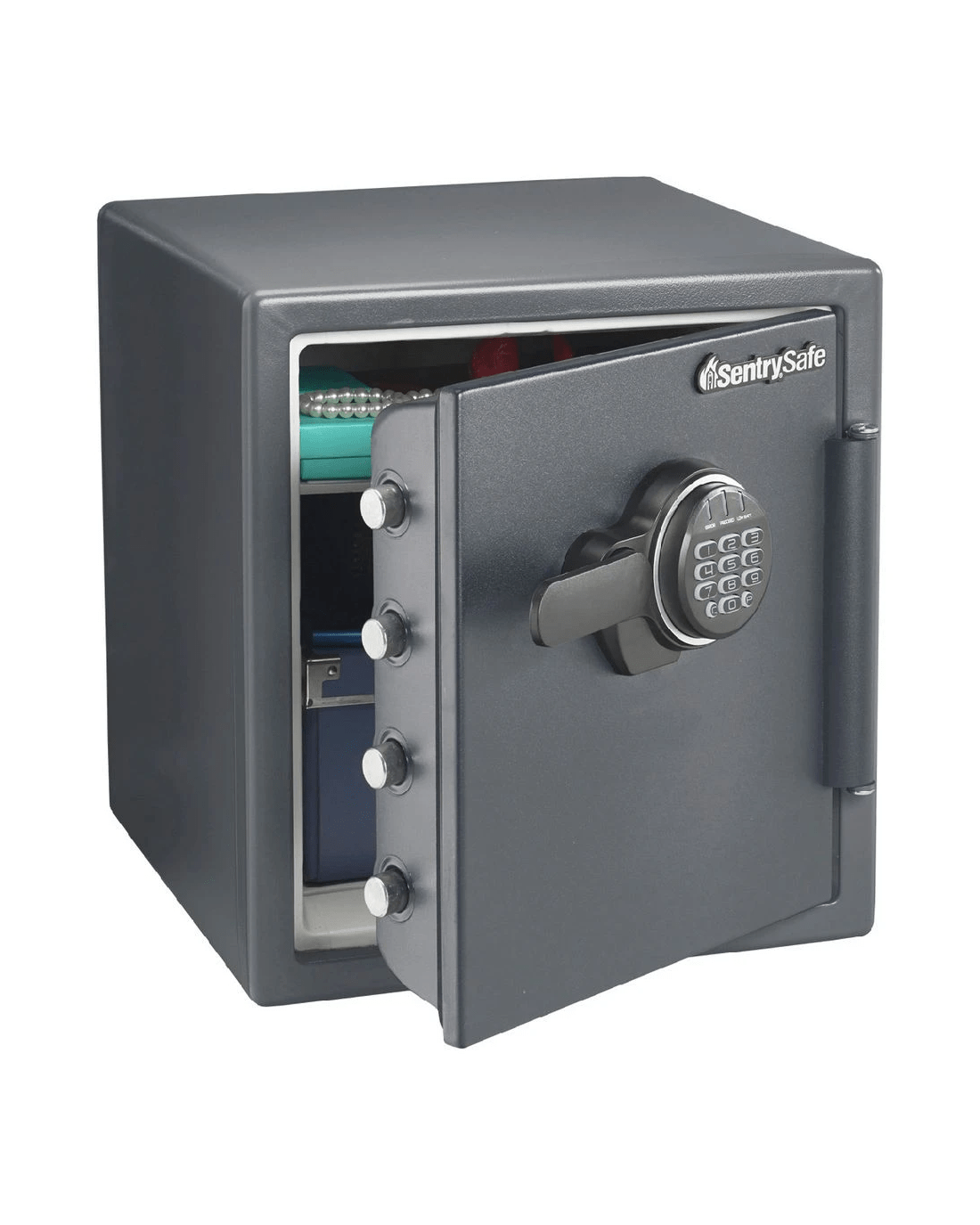 The Sentry Safe Digital Fire and Water Resistant Safe offers protection for your important documents, digital media and other valuables. It’s designed to protect your items in the case of a fire or flood.
