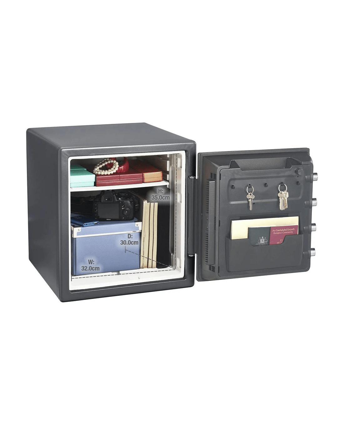 - The safe comes with a multi position shelf, key rack and door pocket for keeping your irreplaceable items secure and organised.