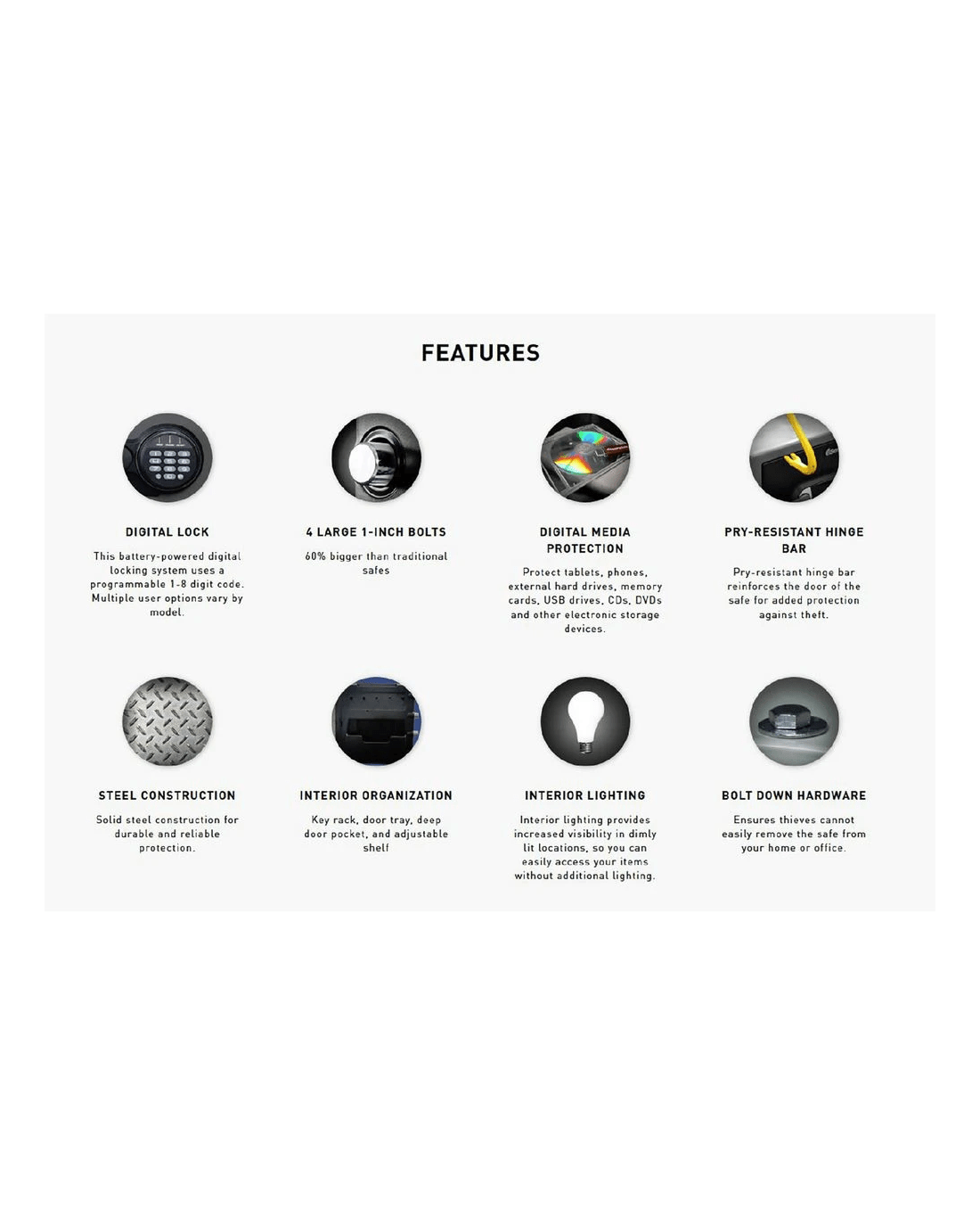 - The safe has an interior capacity of 34.8 L.