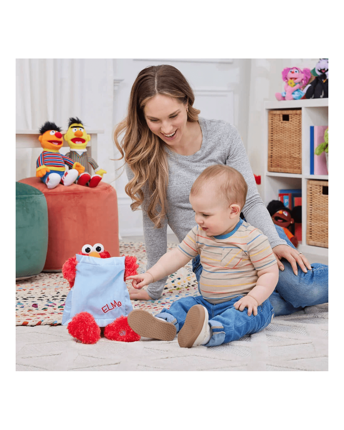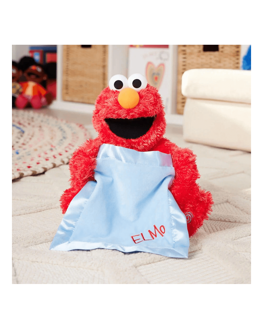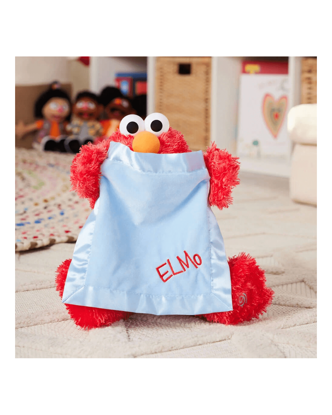 With his contagious giggle and infectious personality, the sound and motion Peek a Boo Elmo recites 13 different phrases as his arms and blanket move up and down! A fun, interactive friend for a baby, this iconic character will entertain for hours as he engages little ones in a fun game of Peek a Boo, encouraging imaginative play and assisting in the development of social skills. On/Off switch on foot. Includes 3 replaceable AA batteries. Phrases are: Elmo loves to play Peek A Boo with you! Oh cool! Elmo can't wait to play with you! Where are you? Peek a boo! There you are! Are you hiding from Elmo? No! There you are! Who's red furry and loves you? Elmo! (giggle) Where are you? Elmo doesn't see you? Oh, there you are! Elmo sees you! Elmo's just getting warmed up baby! Peek... a-boo! (giggle). Hey, who turned out the lights? Oh never mind! Elmo's a silly monster! Guess who's behind the blanket. It's Elmo! (giggle) Hooray! Where are you? Oh, there you are! Right where Elmo left you! (giggle)Again! Again! Peek a bye bye! (giggle).