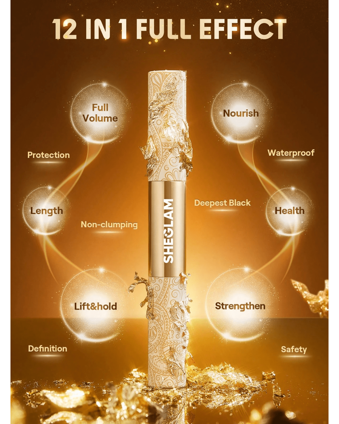 Unleash the gold standard in lash luxury with SHEGLAM's All-In-One 24K Multi-Effect Mascara. Infused with real 24K gold and a powerful blend of nourishing ingredients-polypeptide, olive oil and Orbignya Oleifera seed oil - this mascara is crafted to give you the ultimate lash experience. This 2-in-1 formula defines and volumises lashes while delivering multi-dimensional effects for full-bodied, sky-high lashes that last!