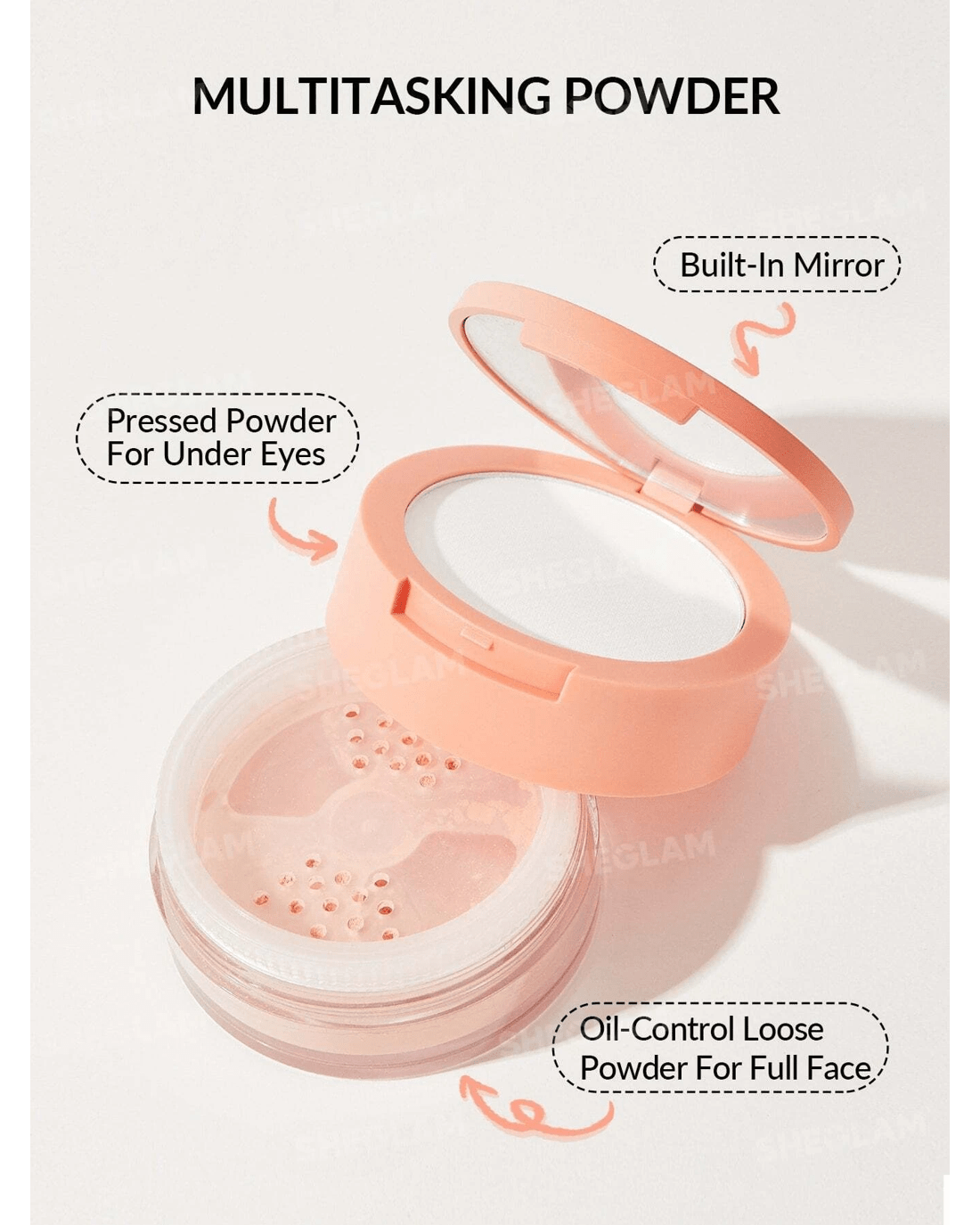 - 2-in-1 multi-tasking design: Two powders in one compact for targeted setting and all-over finishing