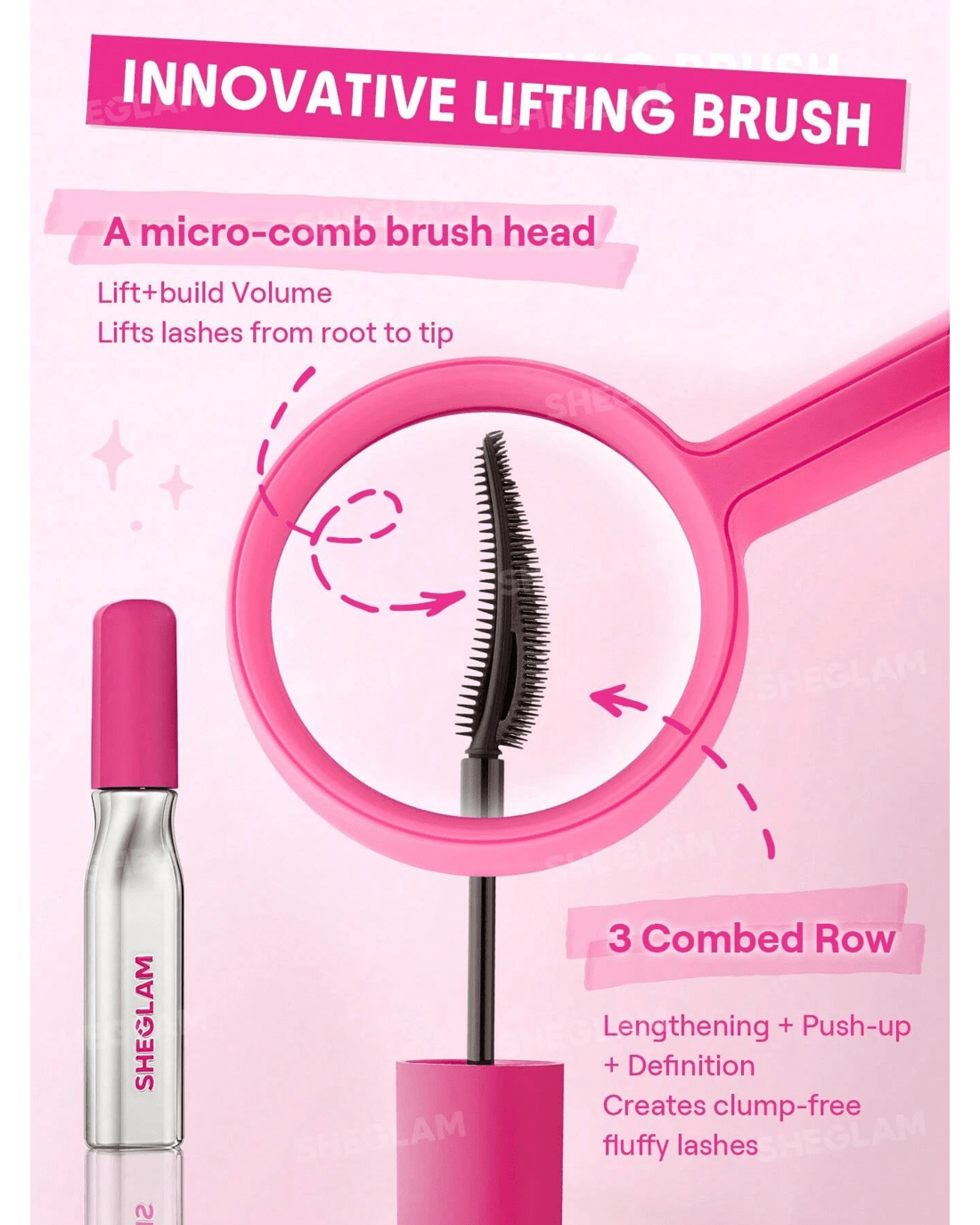 • Feather-comb brush: Designed to hug your lash line and coat every lash evenly