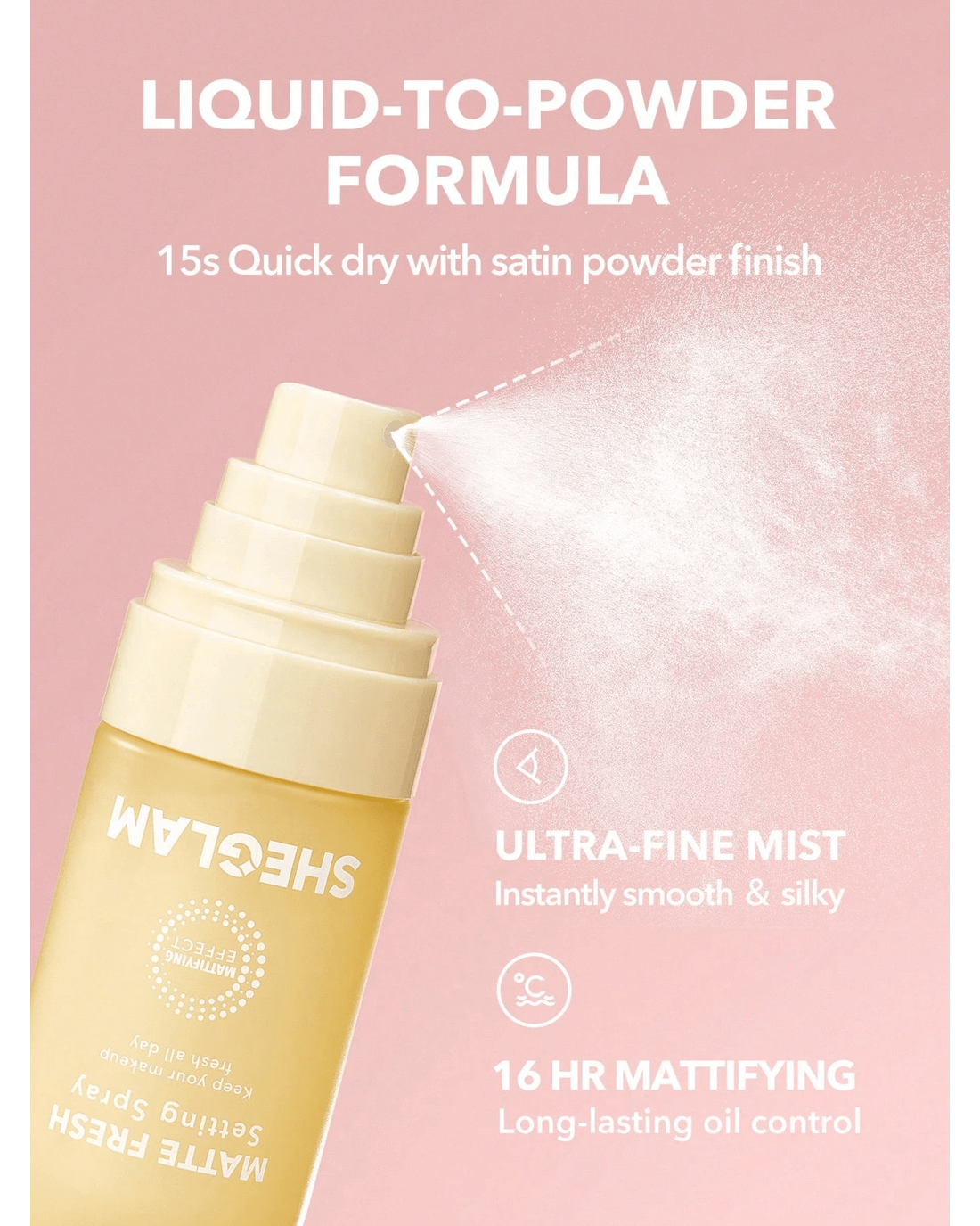 Lock in your look with the SHEGLAM Matte Fresh Setting Spray - your all-day essential for a smooth, shine-free finish that stays put. Designed to set your makeup while keeping oil and excess shine under control, this lightweight mist delivers a fresh matte effect without feeling heavy or tight.