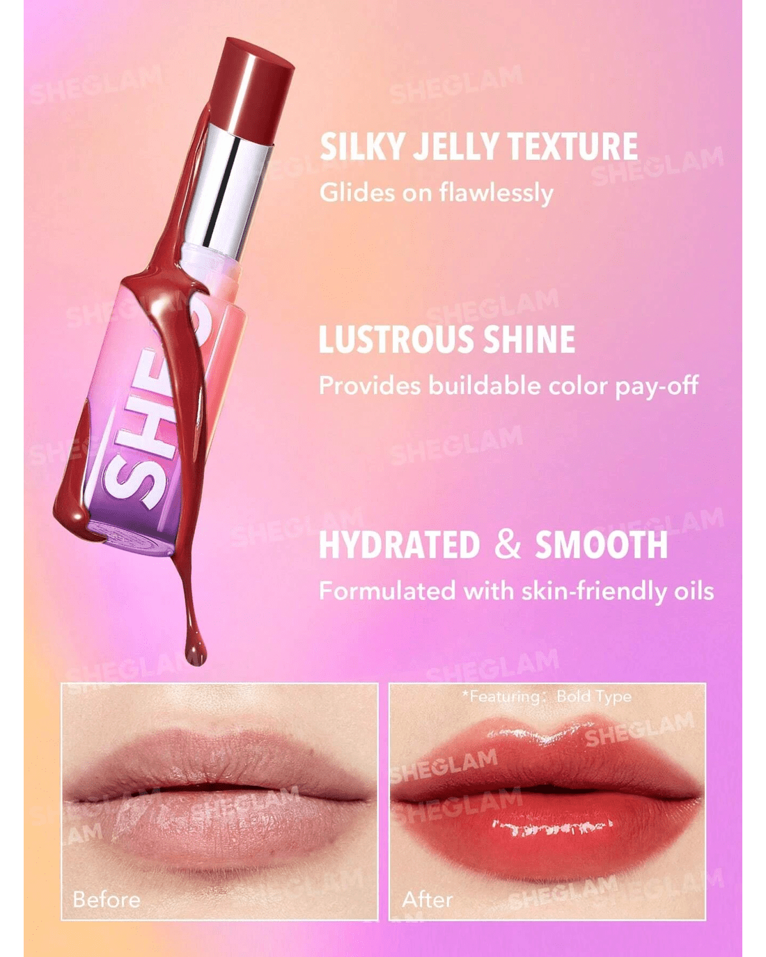 Our SHEGLAM Mirror Kiss High-Shine Lipstick features a silky jelly texture that applies seamlessly on your lips, a super lustrous shine, and a luxe buildable colour in the same SHEGLAM Lipstick shades you know and love. Formulated with skin-friendly oils, this lippie keeps your pout hydrated and smooth all day. Show off your shine with SHEGLAM's Mirror Kiss High-Shine Lipstick. The perfect mix of gloss, comfort and colour for lips that light up every room.
