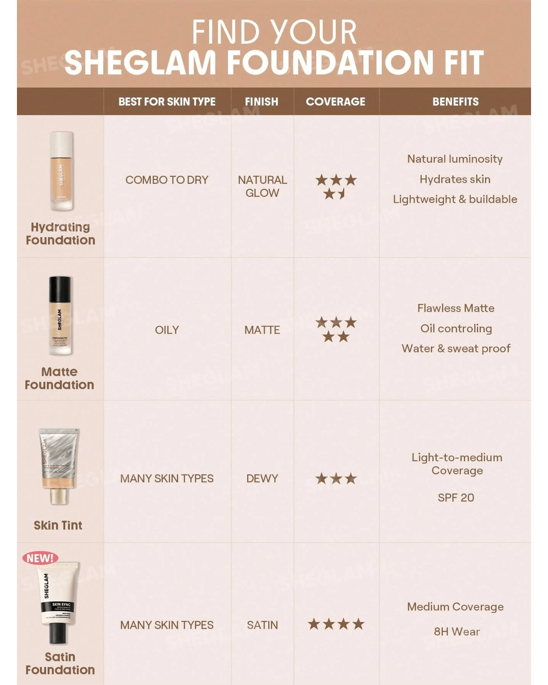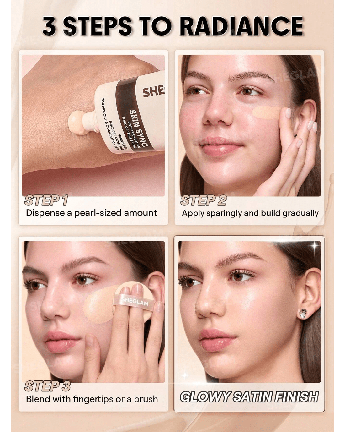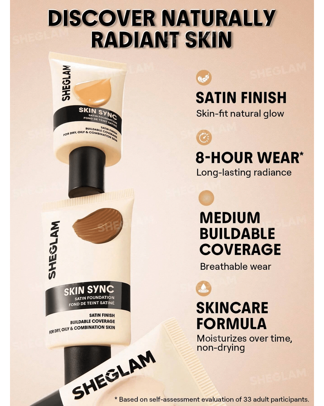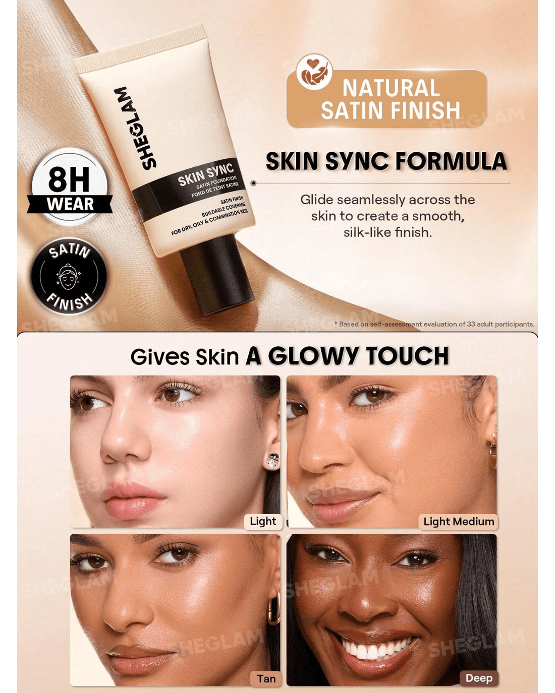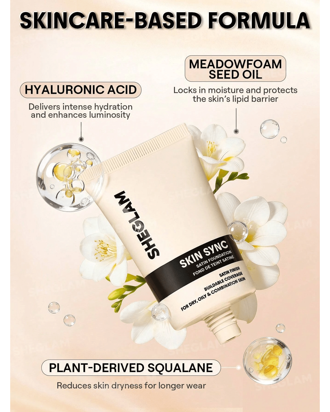 Foundation that feels like you, only smoother! SHEGLAM's Skin Sync Satin Foundation gives you that just-right mix of glow and coverage with zero cake and zero fuss. Our oh-so-silky formula sweeps on like butter for an even, second-skin finish, while soft-focus technology blurs pores and fine lines in a snap. Plus, skin-loving boosts of meadowfoam seed oil, sodium hyaluronate, and squalane keep you hydrated and radiant for hours on end. It's the kind of base you'll actually look forward to putting on for your GRWM!