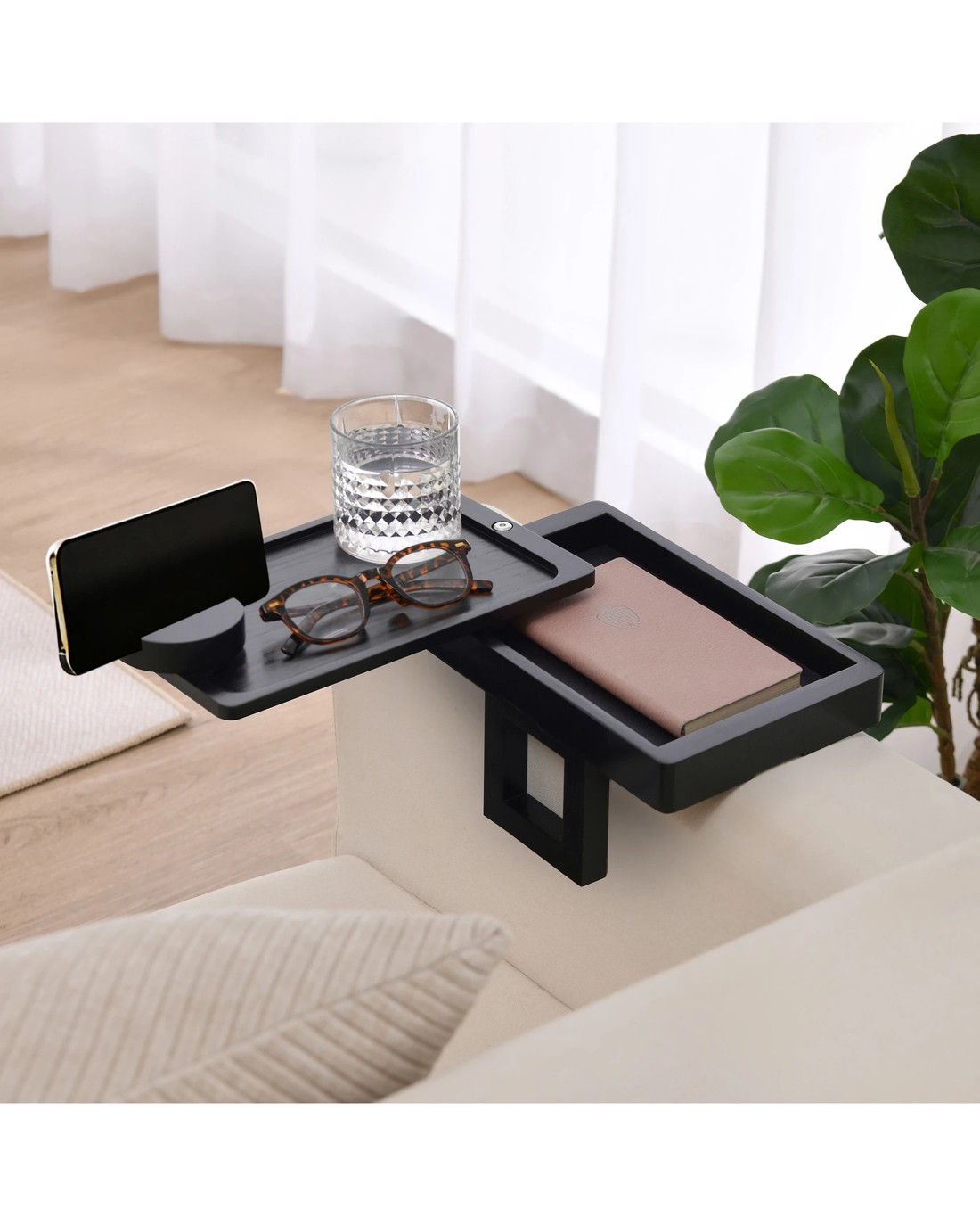 Bring convenience and comfort to your sofa with the Sherwood Japandi Armrest Sofa Tray Table in Black - a simple and practical way to keep everything you need right by your side. No more balancing drinks on the floor or losing the remote between cushions. This handy tray secures easily onto your sofa arm, giving you a steady spot for your phone, glasses, snacks, or a hot beverage. With adjustable legs, it fits a wide range of sofa arms (short edge: 5-19cm / long edge: 4.5-10.5cm), while the 360° rotating top means you can set things exactly how you like them. The non-slip faux leather mat keeps the bottom section neatly lined, adding extra stability for your items so you can relax with confidence. Plus, the integrated smartphone holder keeps your device upright and within easy reach for hands-free scrolling, streaming, or video calls. Lightweight, compact, and easy to install, it's a great addition to any lounge room - whether you're in a big family home, a cosy apartment, or your first place.