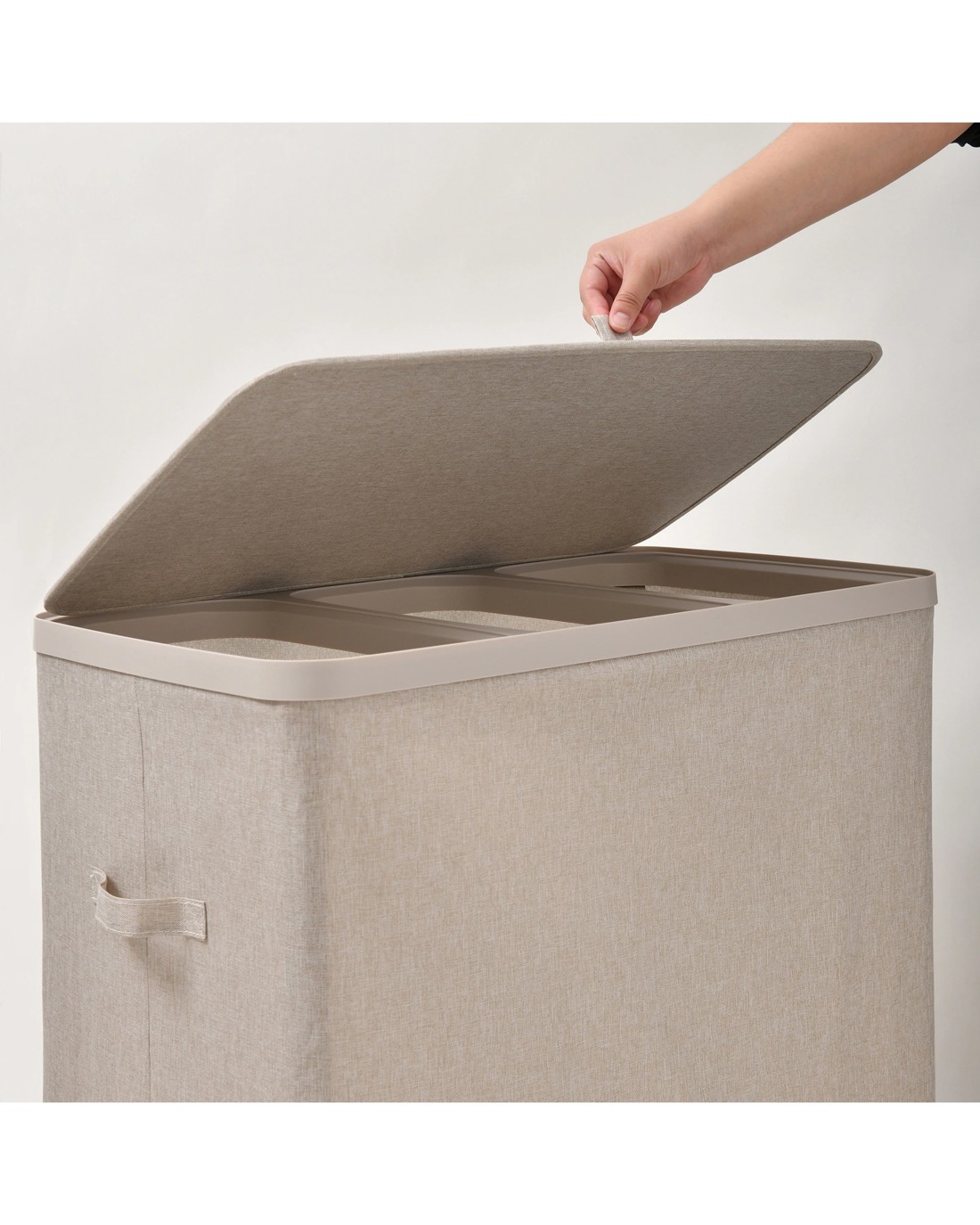 The Sherwood Voyager 3-Section Laundry Hamper offers a modern, practical way to keep laundry organised and sorted in one place. Available in Grey, Natural, and Black, its faux linen exterior blends seamlessly with modern, boho, or minimalist decor while remaining breathable to help reduce odour build-up. Designed with three separate compartments, it makes it easy to sort lights, darks and delicates (or adults, kids and towels) as you go - saving time on laundry day and keeping piles under control. With a generous 120L total capacity, it’s ideal for family use, and the removable triple tote bag liners make carrying loads to the wash simple with convenient handles. Lightweight yet sturdy, it holds its shape with reinforced sides and support rods, and folds flat for compact storage when not in use. Side and base handles make lifting easy, while the hinged lid keeps laundry neatly contained for a tidy look.