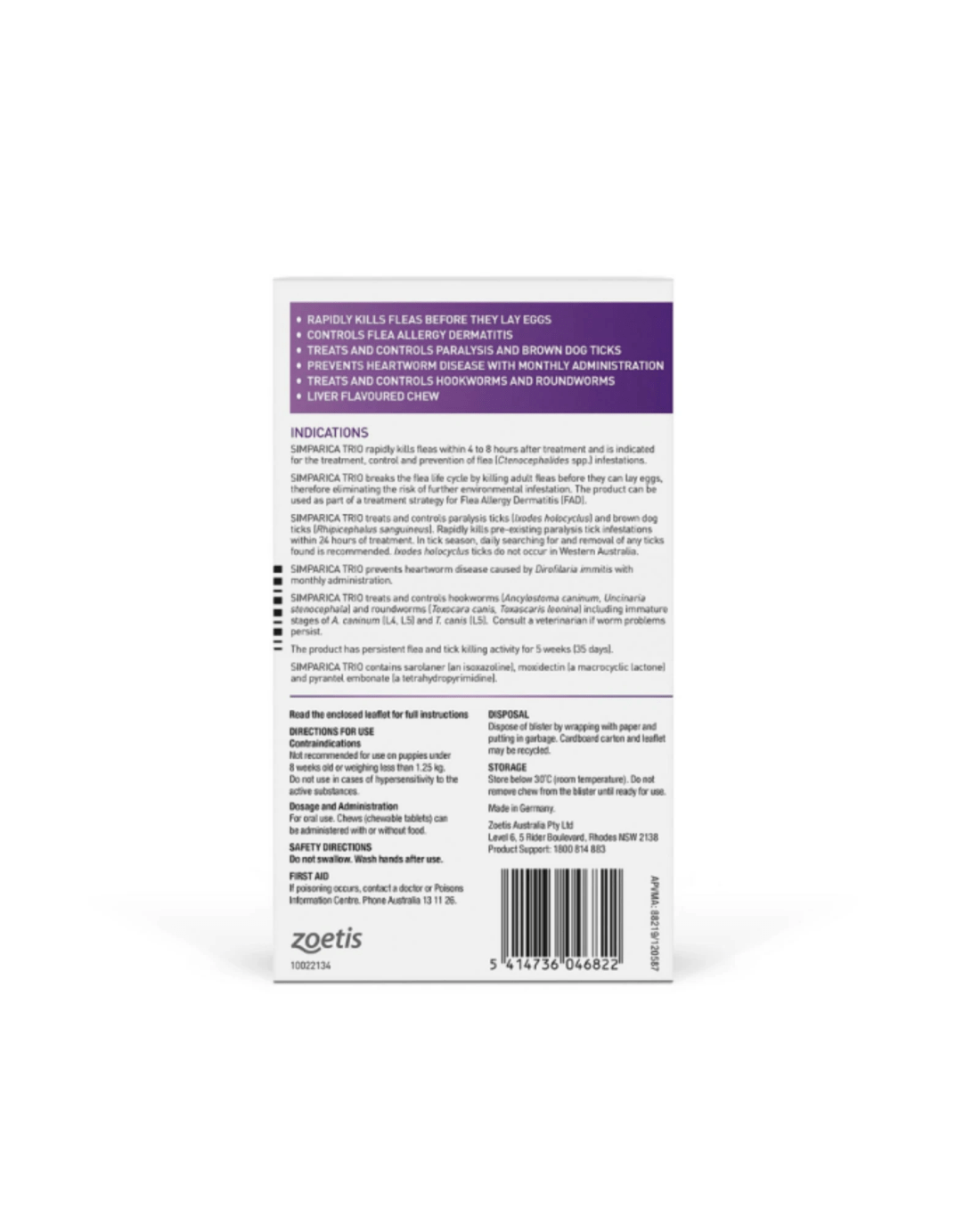 Simparica is a safe, monthly chewable tablet for dogs that provides fast and long-lasting protection against fleas, ticks, and mites. It kills fleas before they can lay eggs and protects your dog for up to 35 days, offering peace of mind even if you’re a few days late with the next dose.