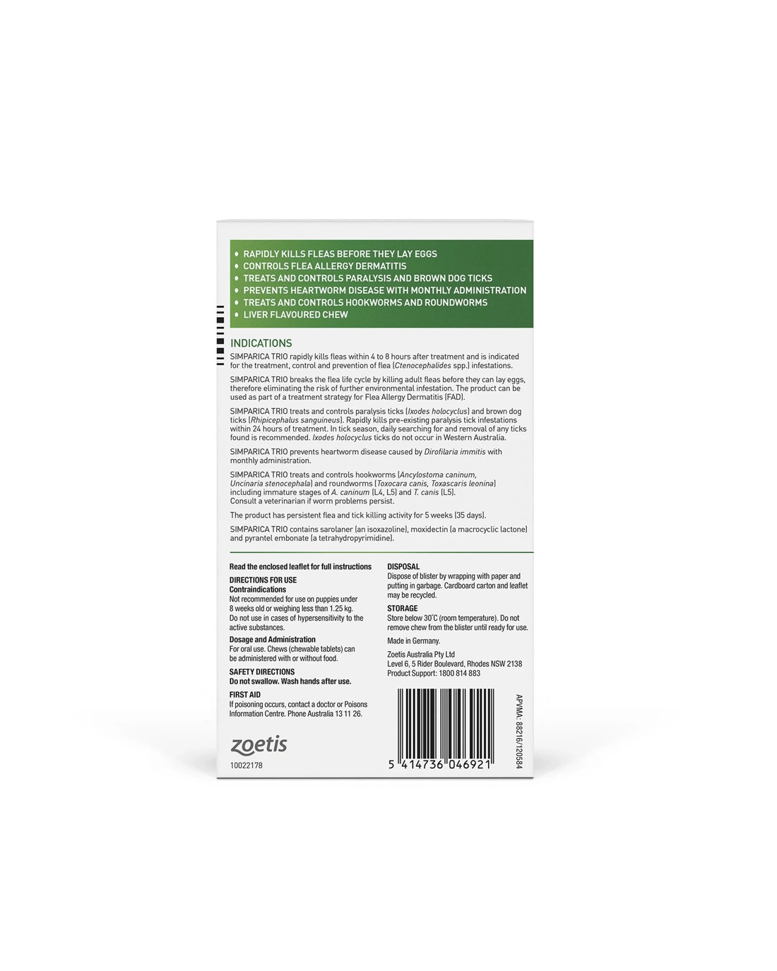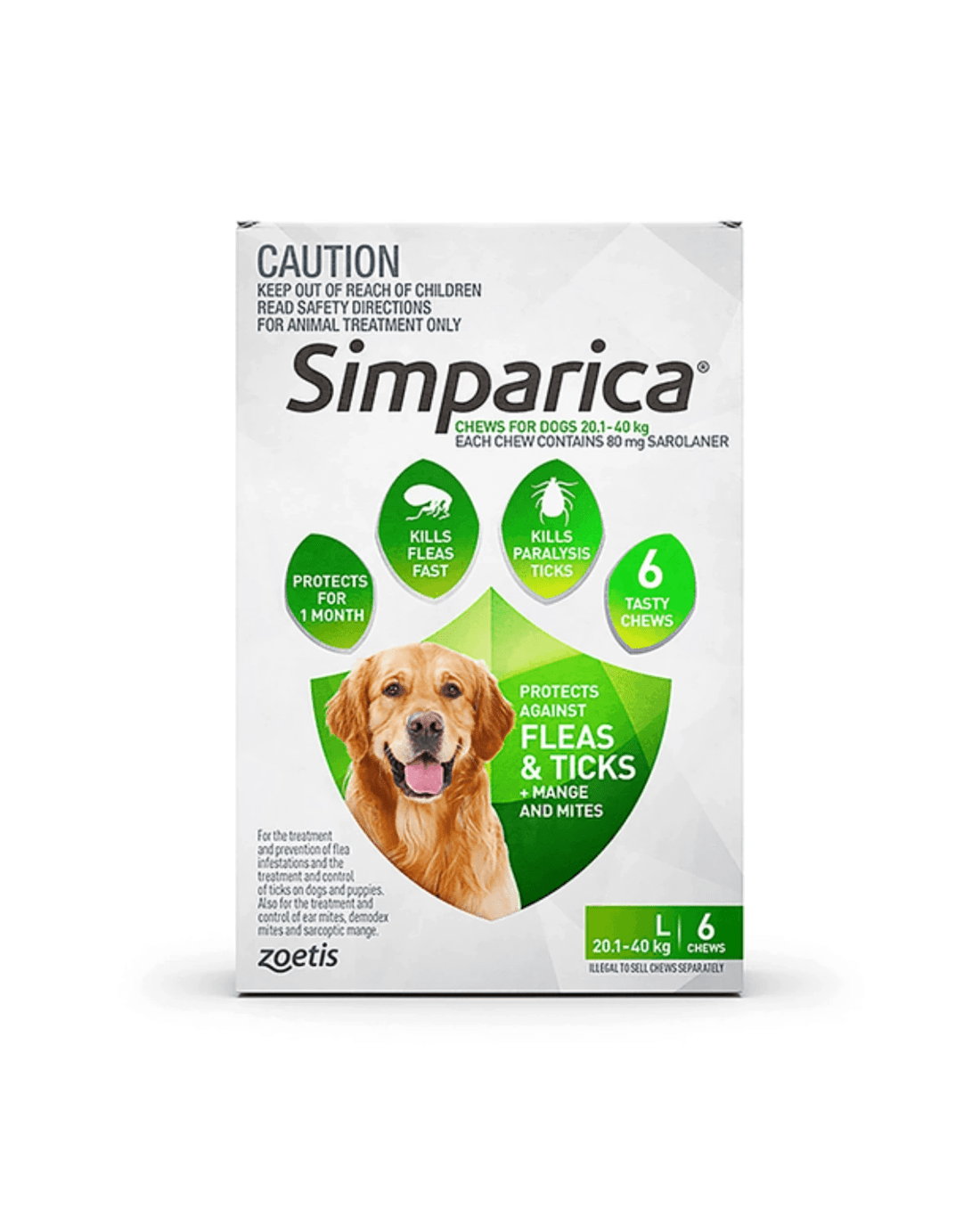 Simparica is a safe, monthly chewable tablet for dogs that provides fast and long-lasting protection against fleas, ticks, and mites. It kills fleas before they can lay eggs and protects your dog for up to 35 days, offering peace of mind even if you’re a few days late with the next dose.