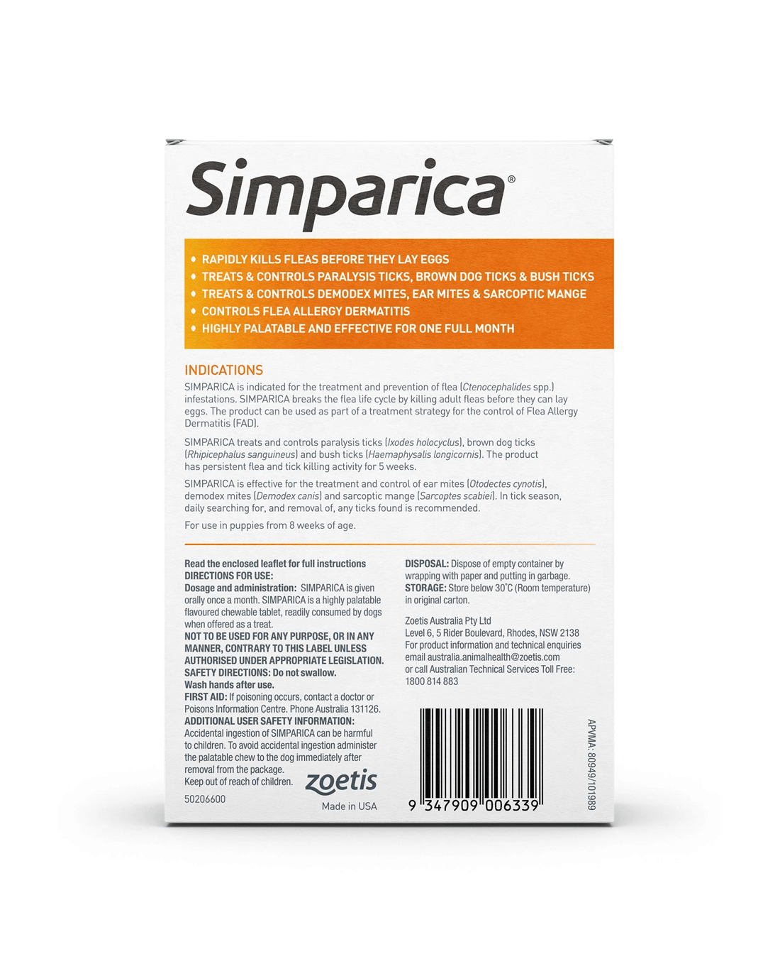 Simparica is a safe, monthly chewable tablet for dogs that provides fast and long-lasting protection against fleas, ticks, and mites. It kills fleas before they can lay eggs and protects your dog for up to 35 days, offering peace of mind even if you’re a few days late with the next dose.