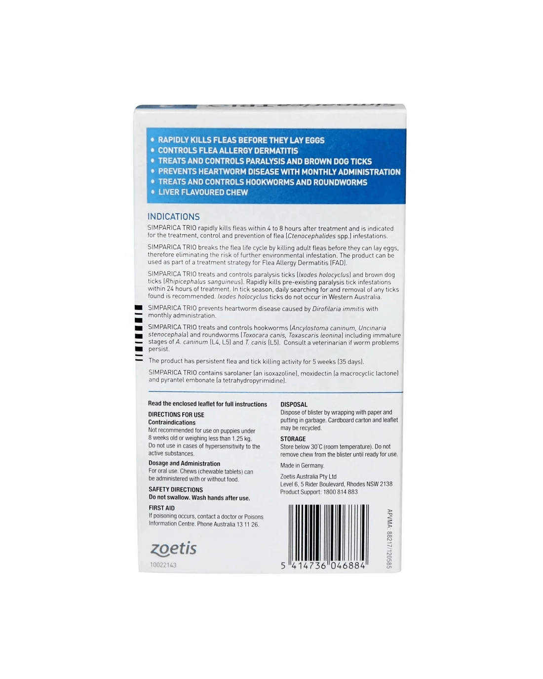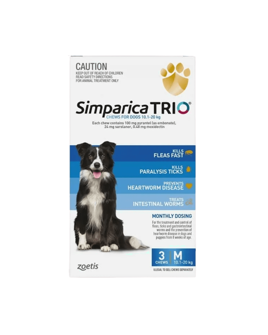 Simparica Trio provides triple protection against fleas and ticks, intestinal worms, and deadly heartworm disease — all in one tasty monthly chew. It contains a unique combination of ingredients, including moxidectin, the same trusted ingredient used by vets to prevent heartworm disease.