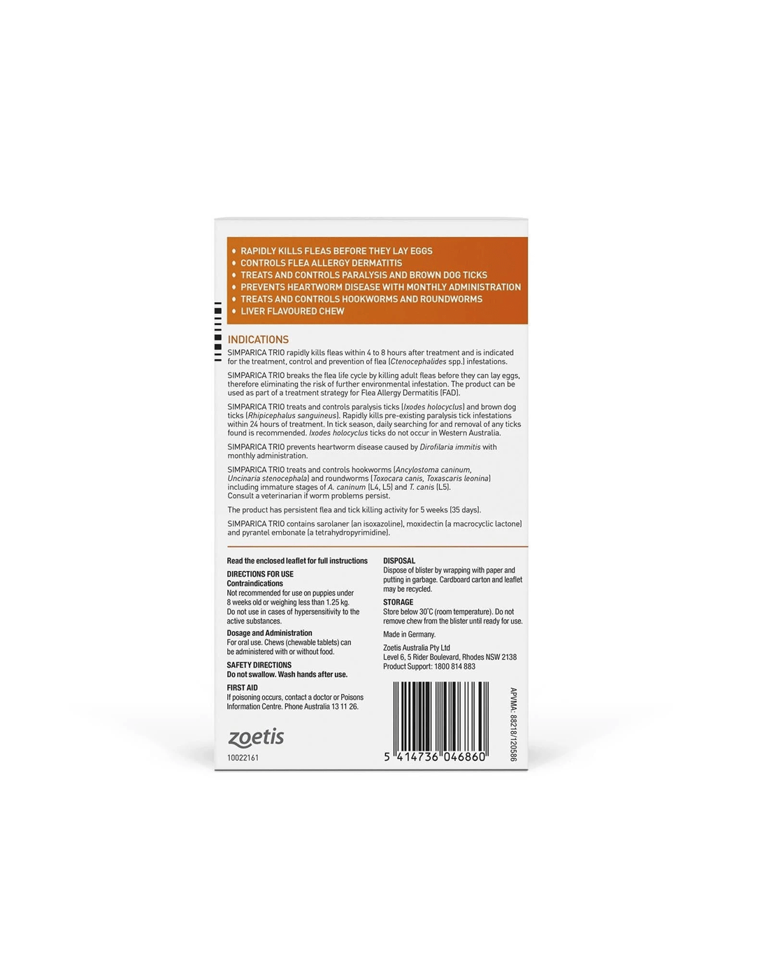 Additional Information: Simparica Trio does not protect against hydatid tapeworm, which can be transmitted from eating raw offal or carcass material (particularly in farm environments). If this applies to your dog, pair Simparica Trio with a wormer containing Praziquantel, such as Drontal, every 6 weeks. It also does not provide protection against the tick-borne disease Ehrlichiosis.