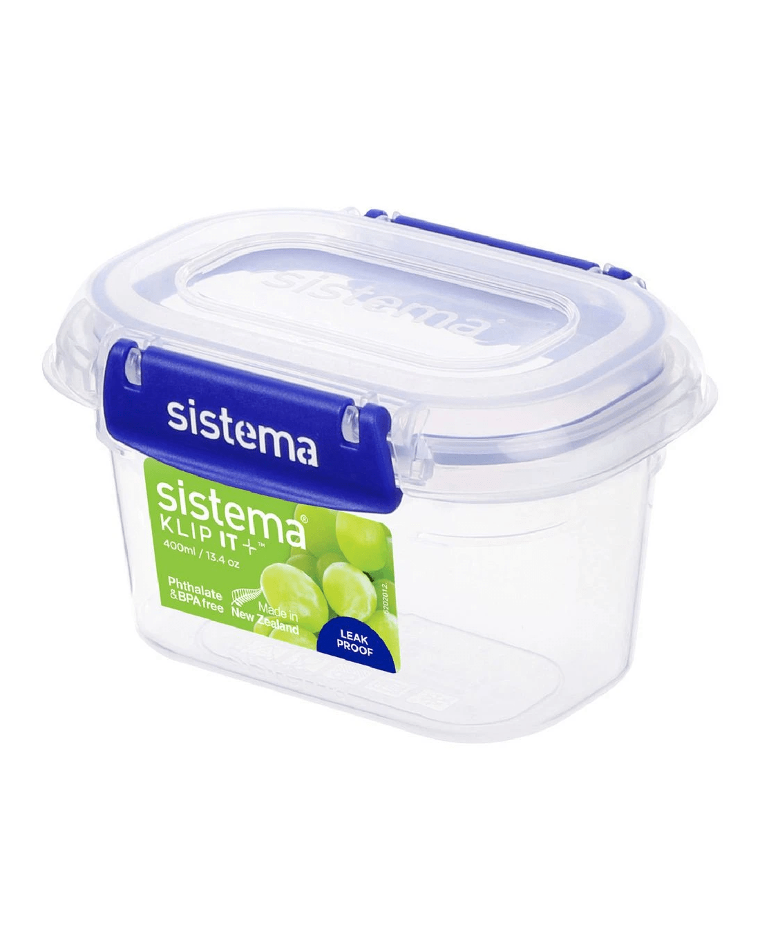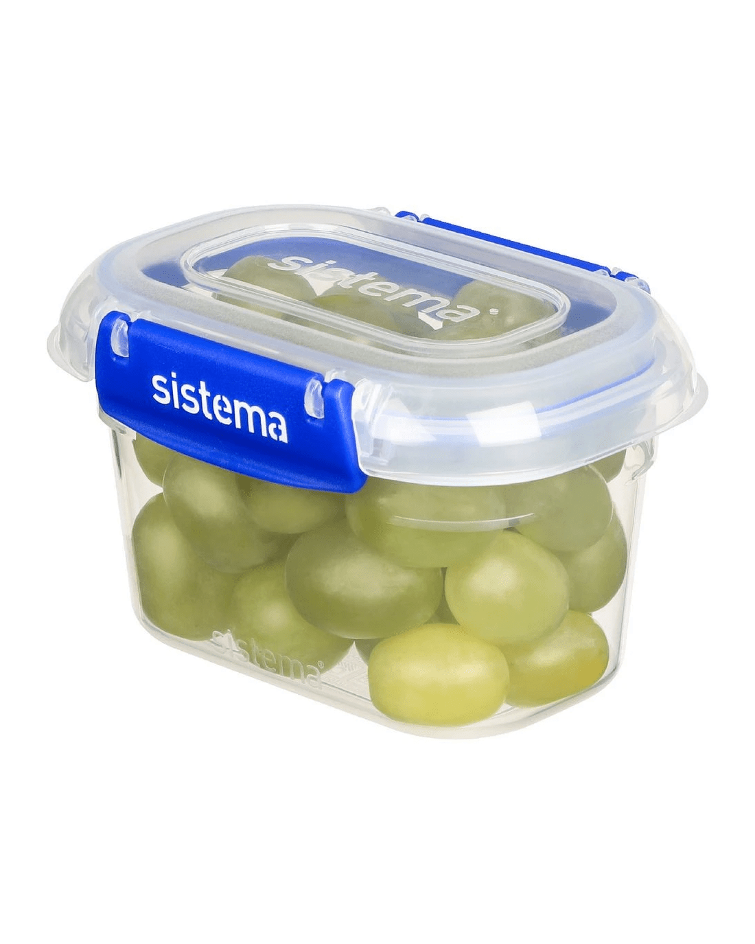 - Each container is clear, with blue Sistema easy-locking clips.