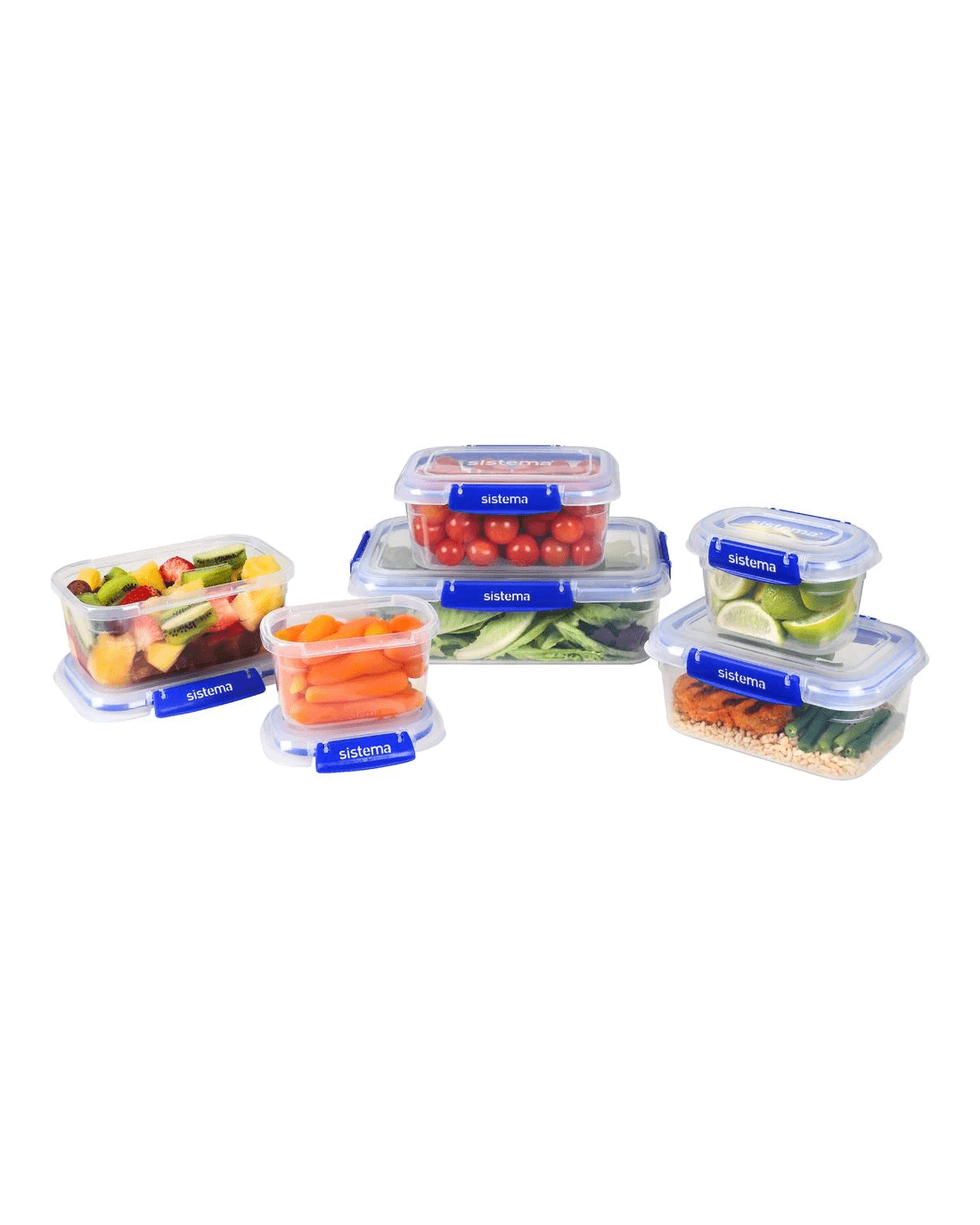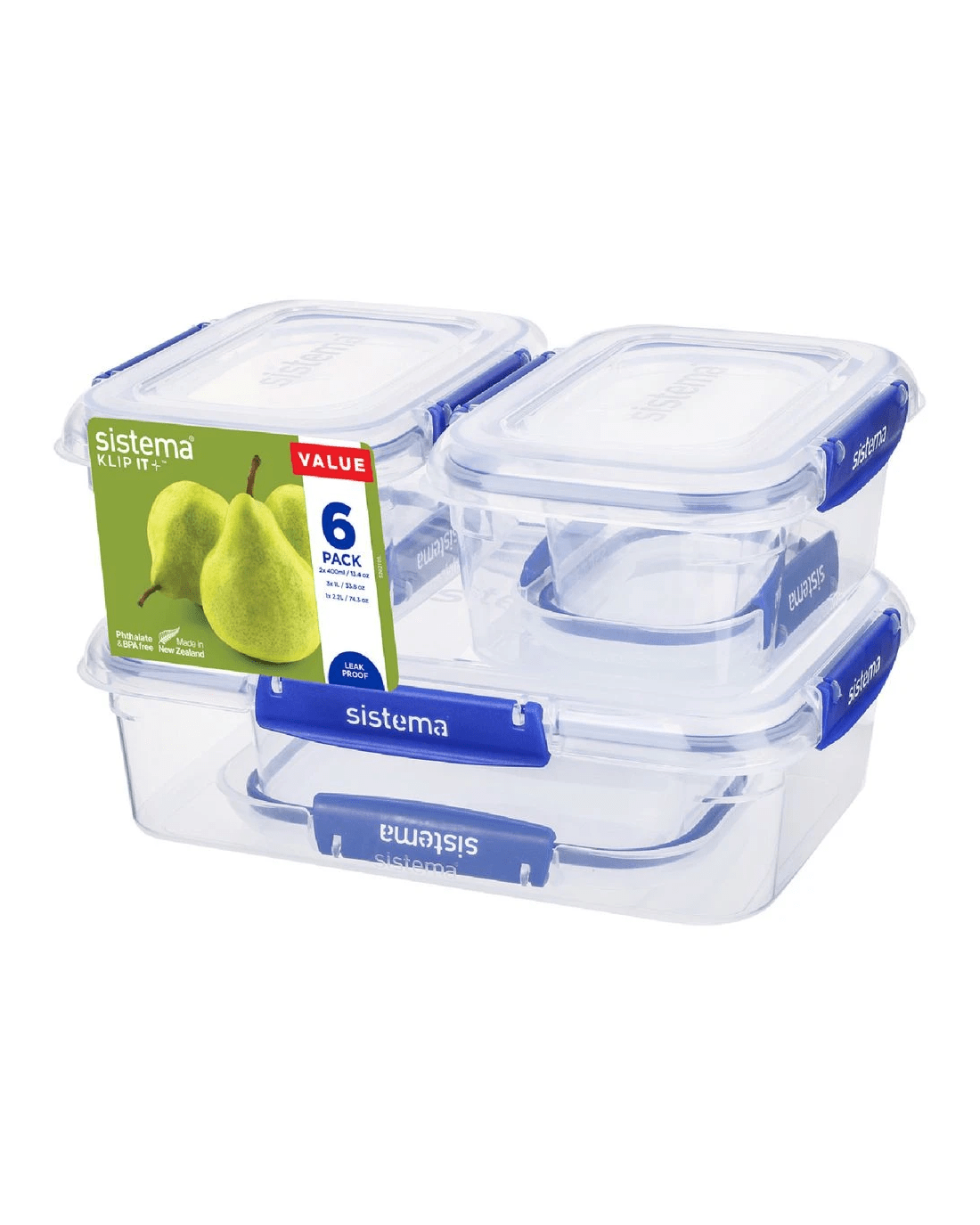 - Each container is clear, with blue Sistema easy-locking clips.