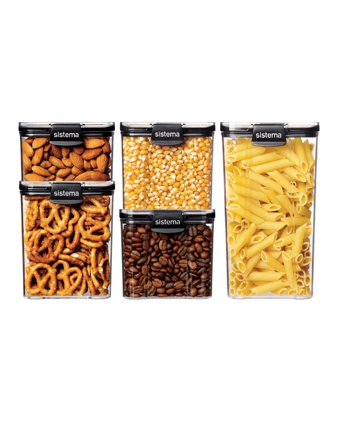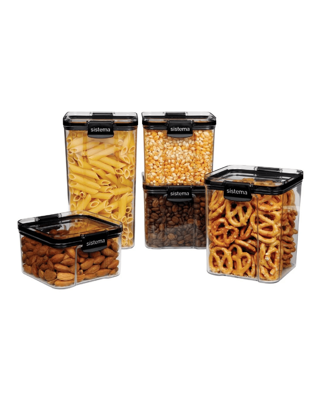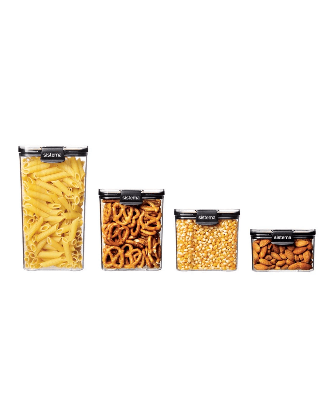 - Each container is clear, with black Sistema easy-locking clips.