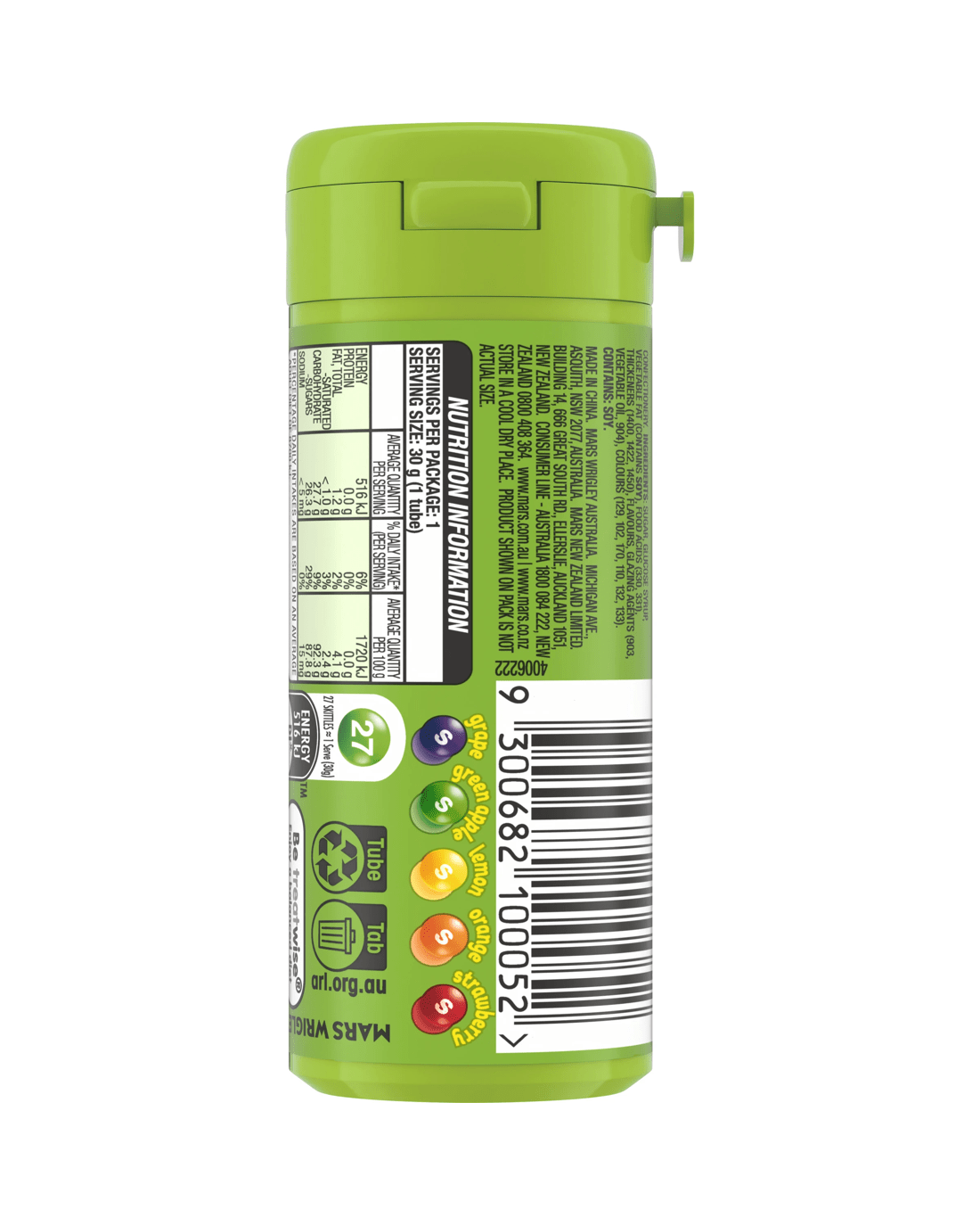 • Ingredients: Sugar, Glucose Syrup, Vegetable Fat, Food Acids (330, 331), Thickeners (1400, 1422, 1450), Flavours, Glazing Agents (903, Vegetable Oil, 904), Colours (129, 102, 170, 110, 132, 133)