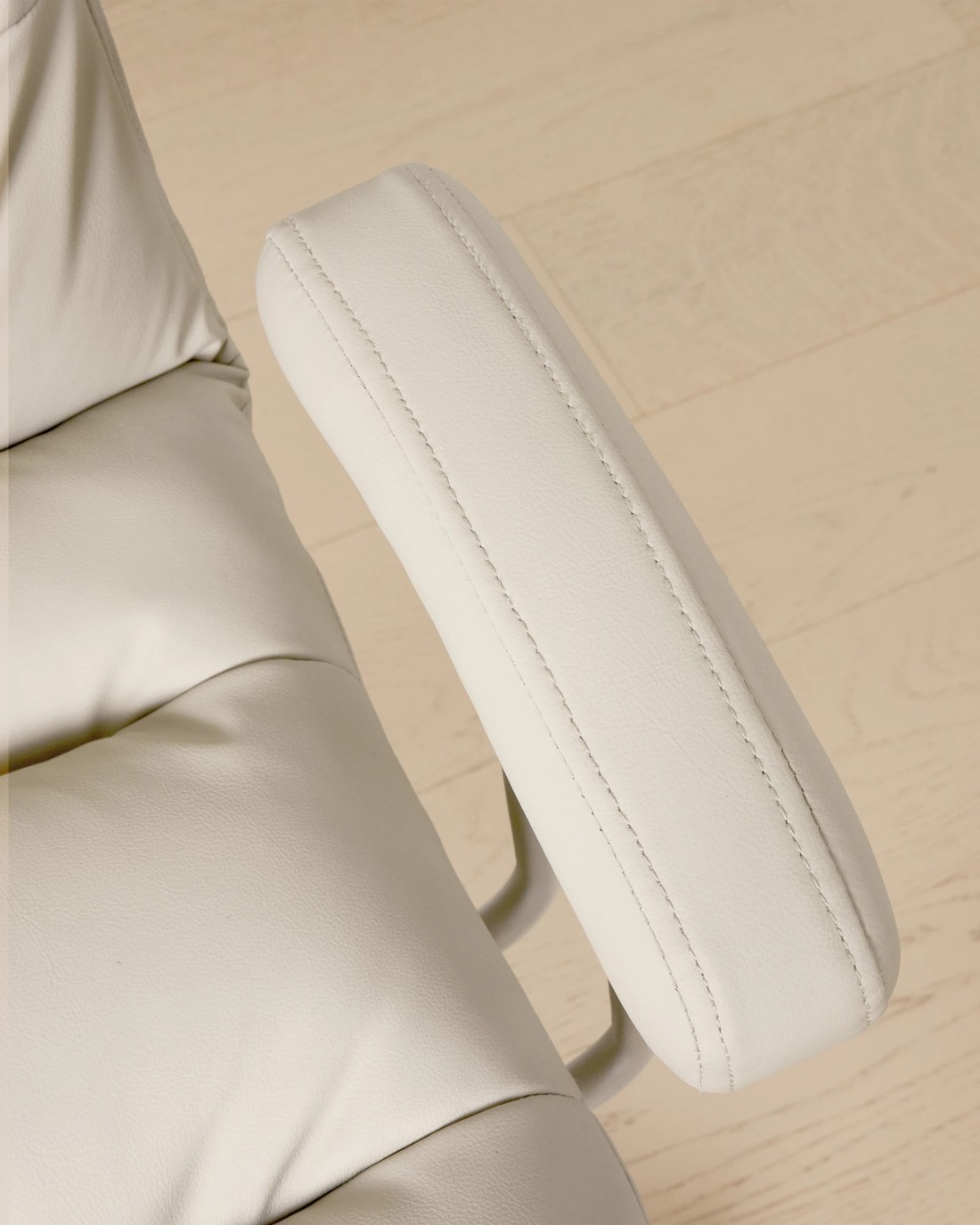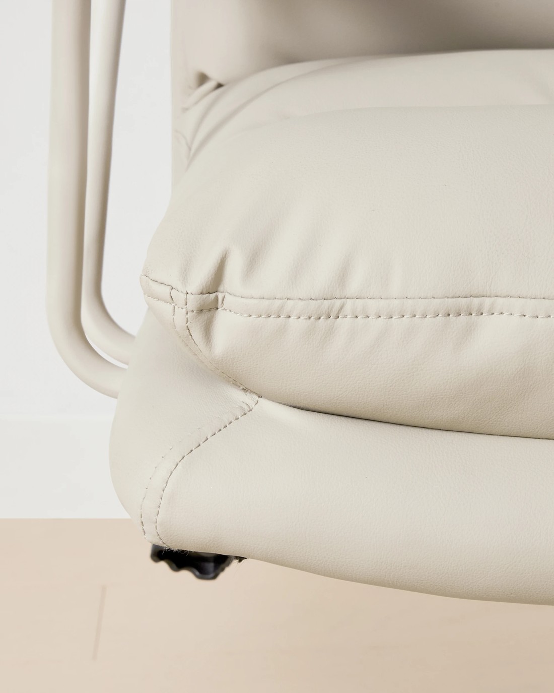 - Its cream faux leather upholstery offers a sleek appearance and is easy to maintain