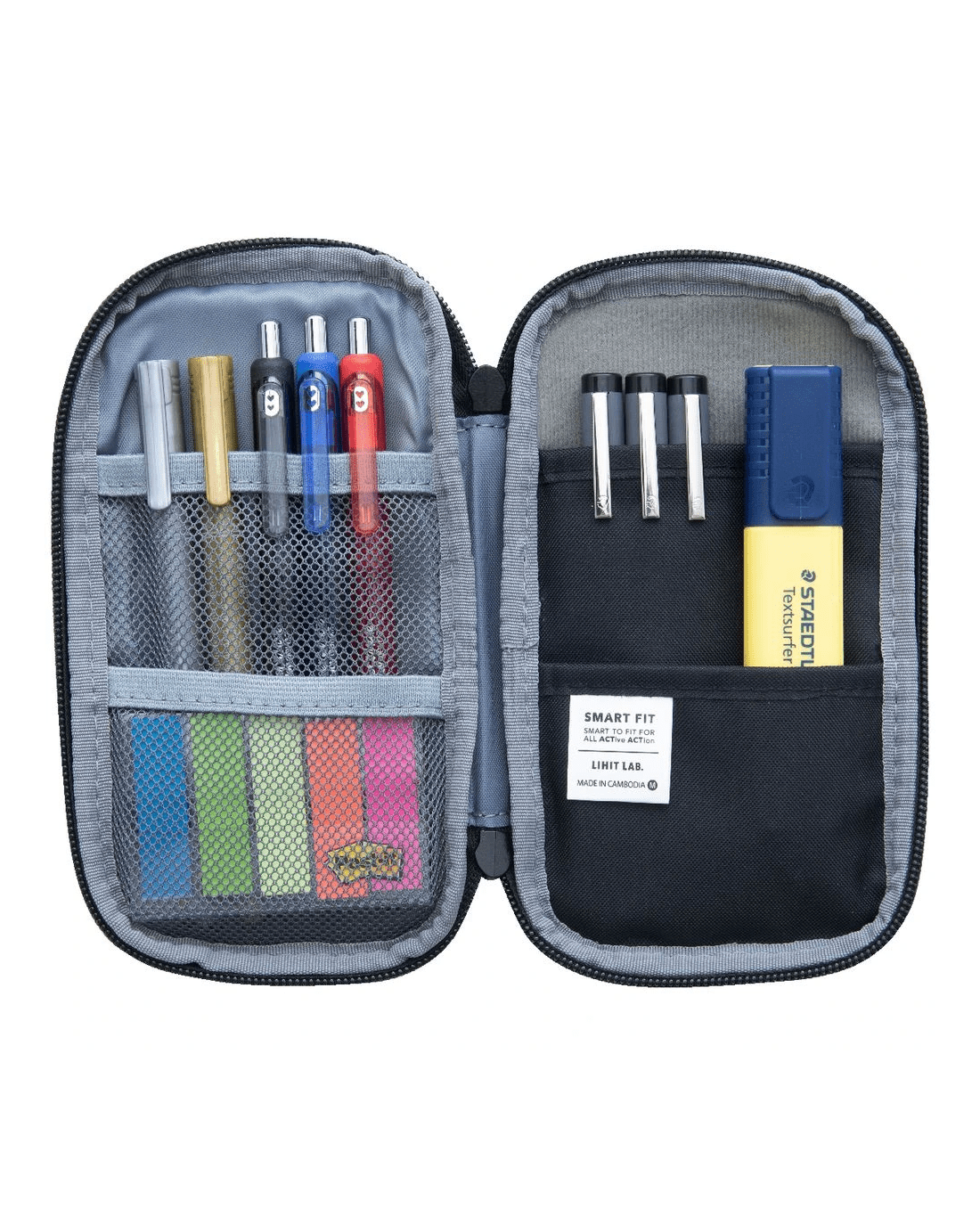 This Lihit Lab Smart Fit Compact Pencil Case is a great way to store and protect your stationery thanks to its durable and water-repellent cover. This case will open like a book and has 2 mesh pockets on one side and 2 pouches on the other.