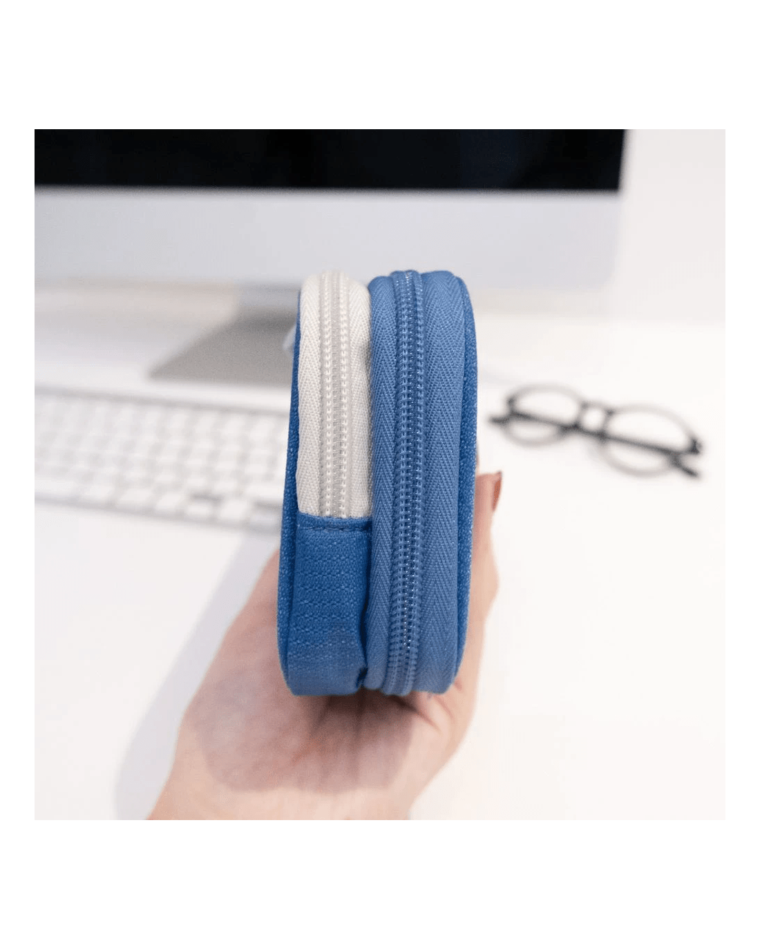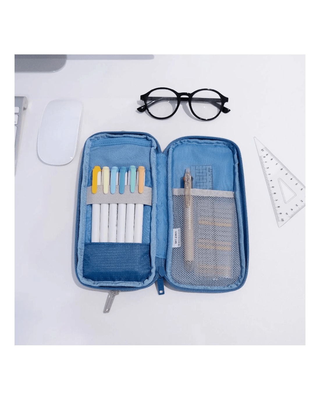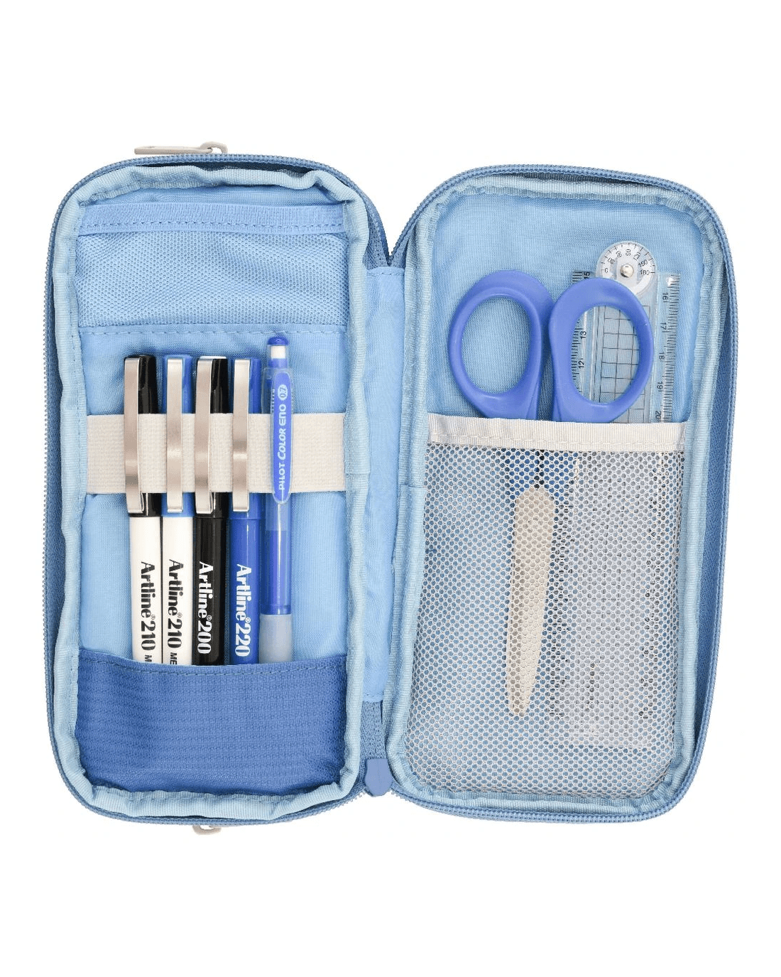 This Multi Compartment Pencil Case features a large front pocket where you can store your bigger stationery items such as a pair of scissors. It also has a back pocket with a zip which opens up around most of the edge allowing the pocket to open up like a book and then lie flat on the desk.