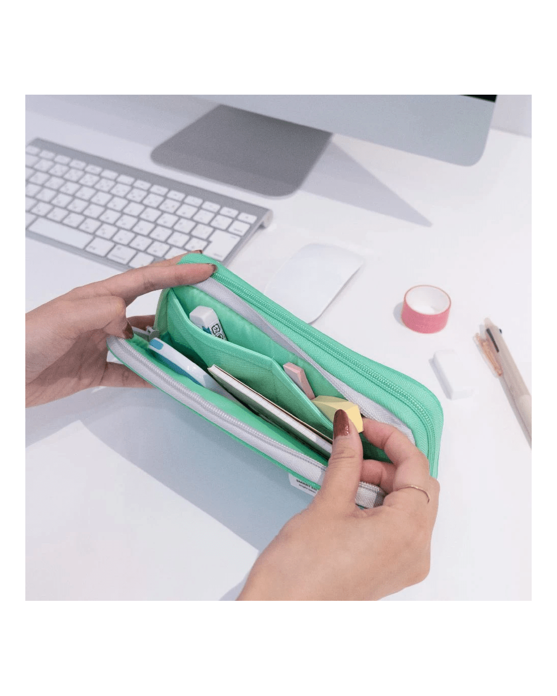 - This pencil case is green coloured.