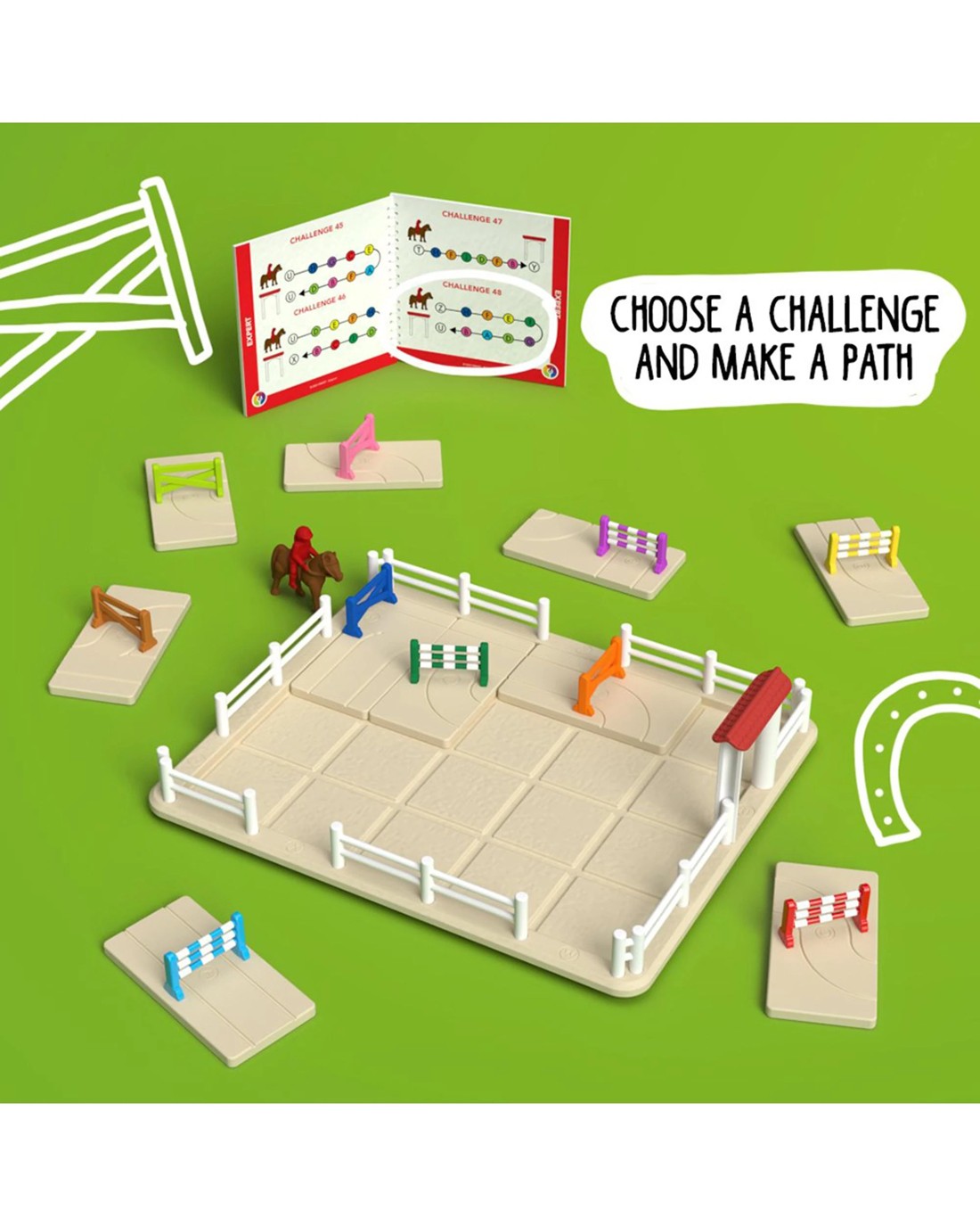 Create a path and jump to the finish! Create a path from start to finish so you can canter over the jumps in the right sequence! Are you on course to solve the 80 challenges? Get on your horse for some puzzling fun! Ages: 7 + | Players: 1