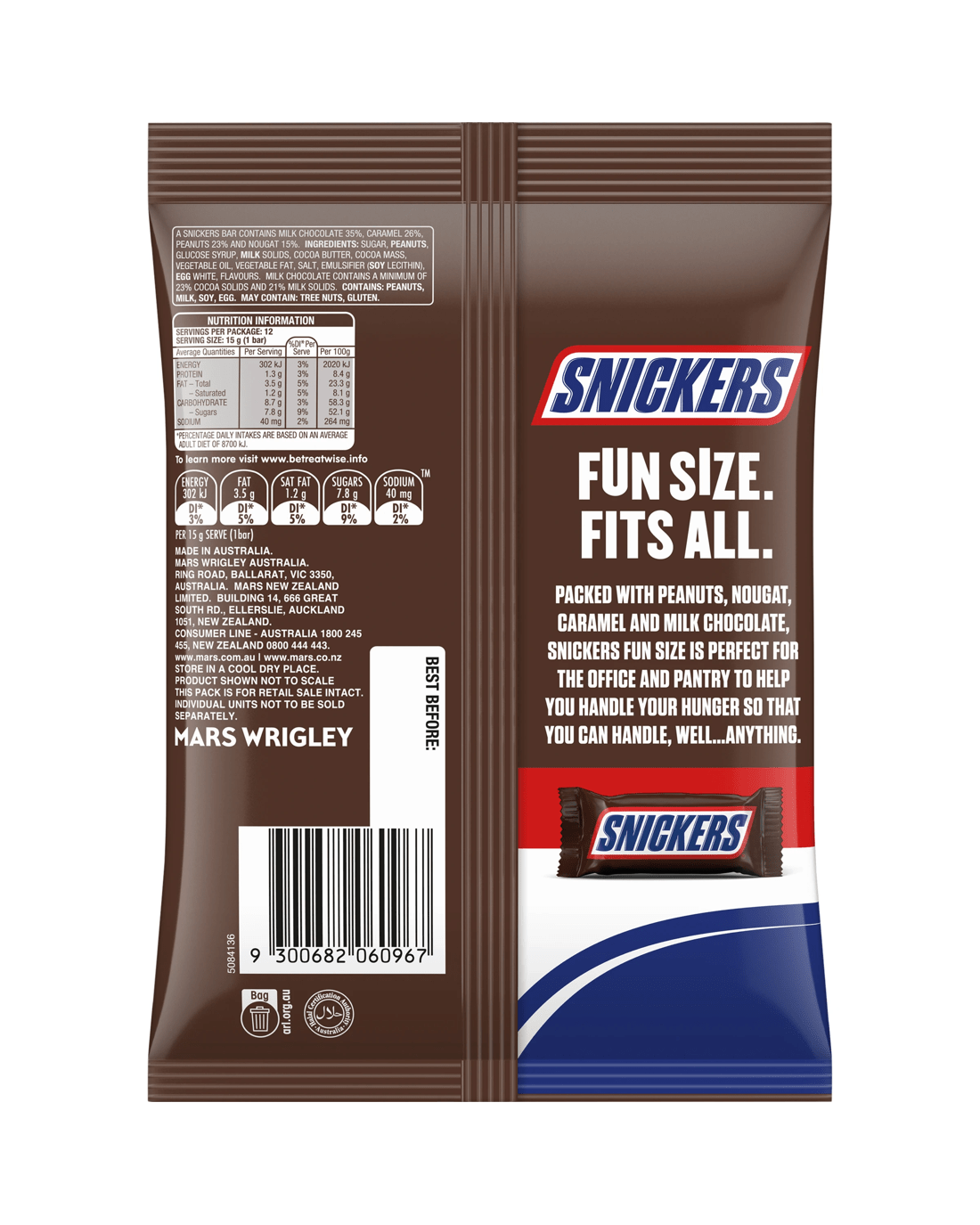 Packed with peanuts, nougat, caramel and milk chocolate, the Snickers Fun Size chocolate bag is perfect for the office and pantry to help you handle your hunger so that you can handle, well...anything. The perfect satisfying treat for those hungry moments on the go or when you need a chocolate bag snack to keep you going until dinner. Packed with nuts, it's satisfaction in every bite of this delicious Snickers chocolate bag. With 12 individually wrapped fun-size Snickers bars, this share pack is perfect for sharing with friends, filling Halloween trick-or-treat bowls and party bags.