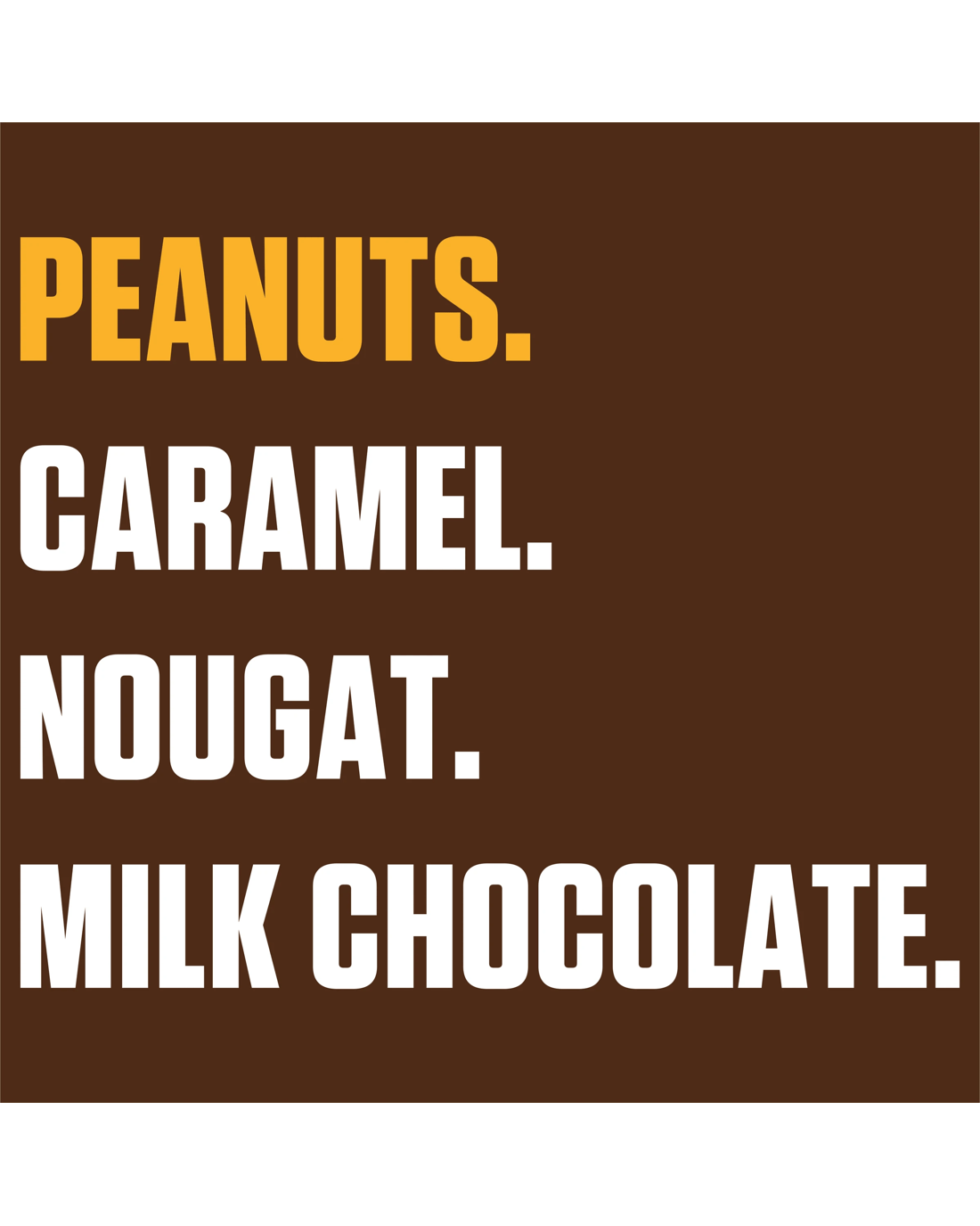 • Ingredients: Sugar, Peanuts, Glucose Syrup, Milk Solids, Cocoa Butter, Cocoa Mass, Vegetable Oil, Vegetable Fat, Salt, Emulsifier (Soy Lecithin), Egg White and Flavours