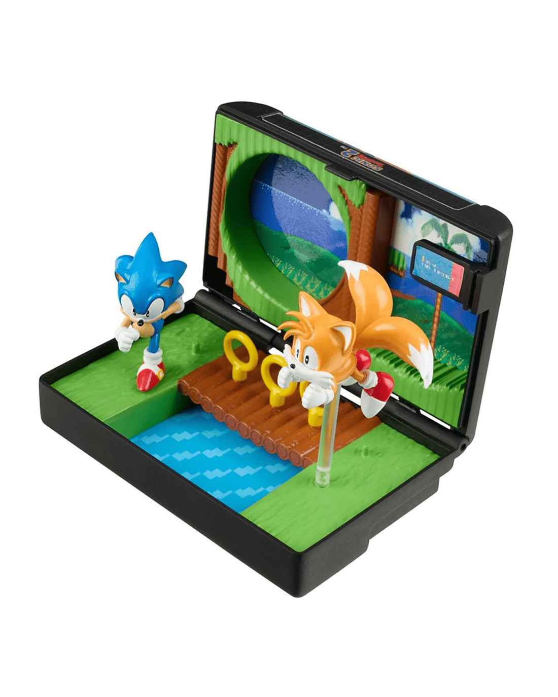 Includes 1.5-inch mini-figures of Sonic and Tails; Sonic pegs into the scene, Tails is mounted on a clear flight stand.