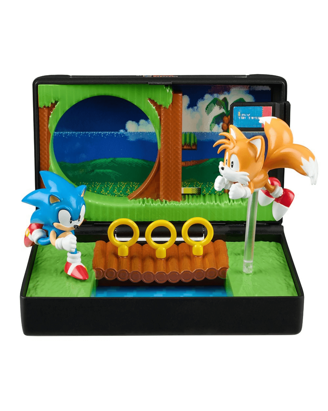 Collectible diorama of Sonic the Hedgehog 2's Emerald Hill Zone, housed in a foldable Sega Mega Drive cartridge replica.