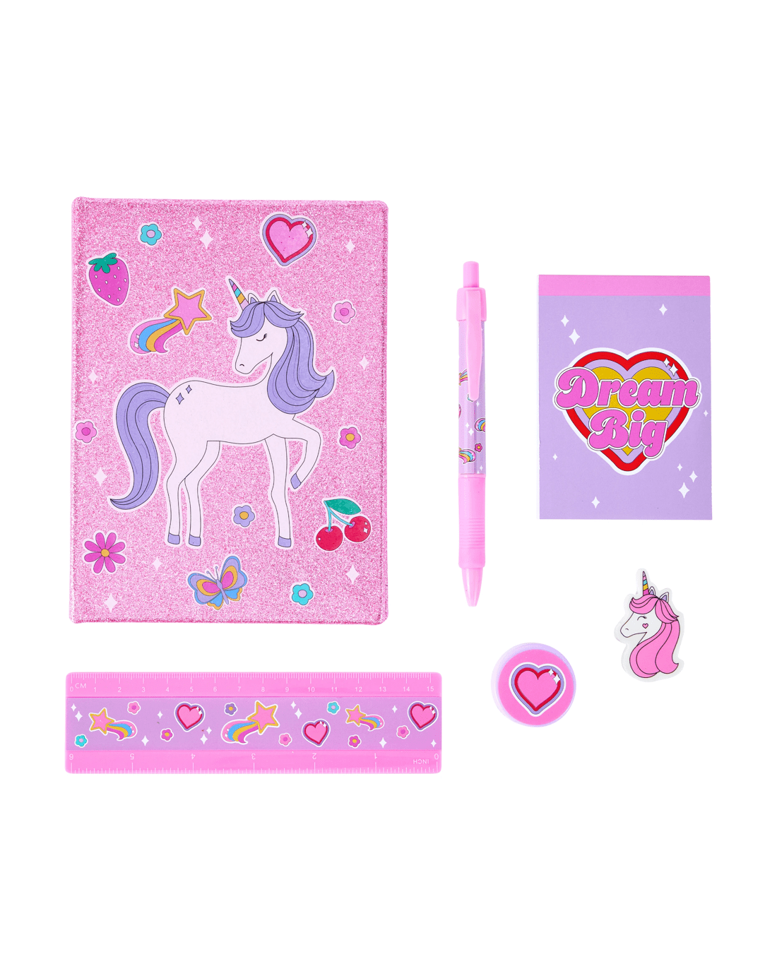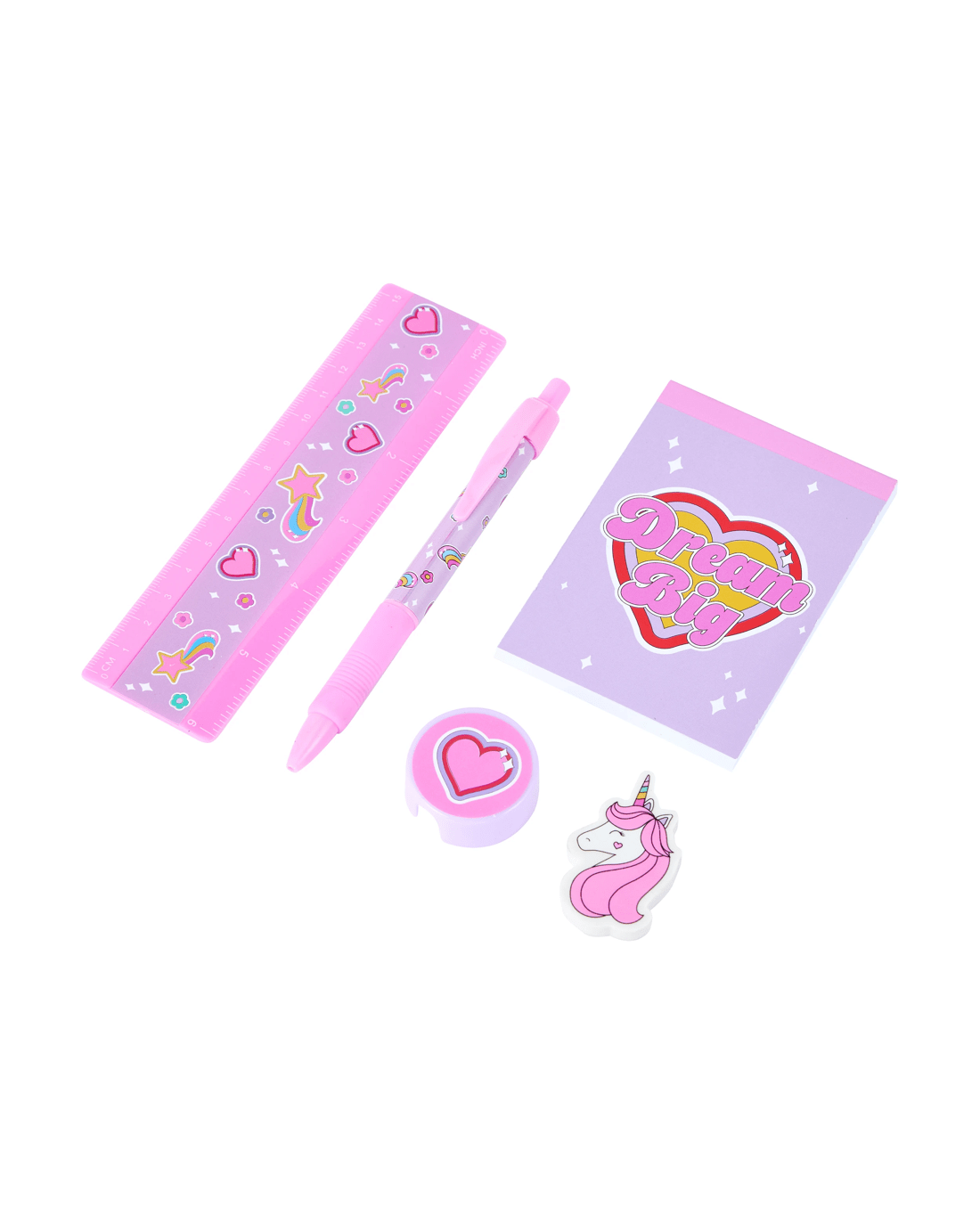 - Includes 1 x ball pen, 1 x eraser, 1 x notebook, 1 x ruler and 1 x sharpener