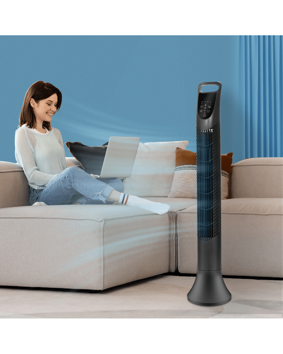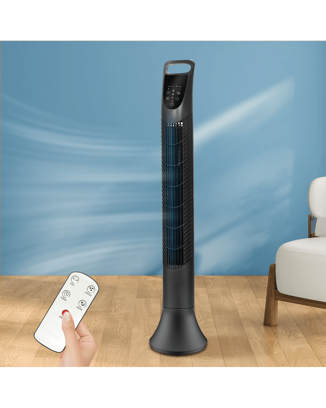 With user-friendly features like a touchable panel, remote control, and a built-in timer function, this electric tower fan offers convenience at your fingertips. A wide 75° oscillating tilt ensures optimal air distribution, making it the ideal air cooler for home or office use. Lightweight and easy to clean, it’s as practical as it is powerful.