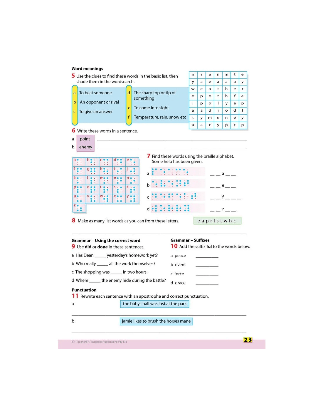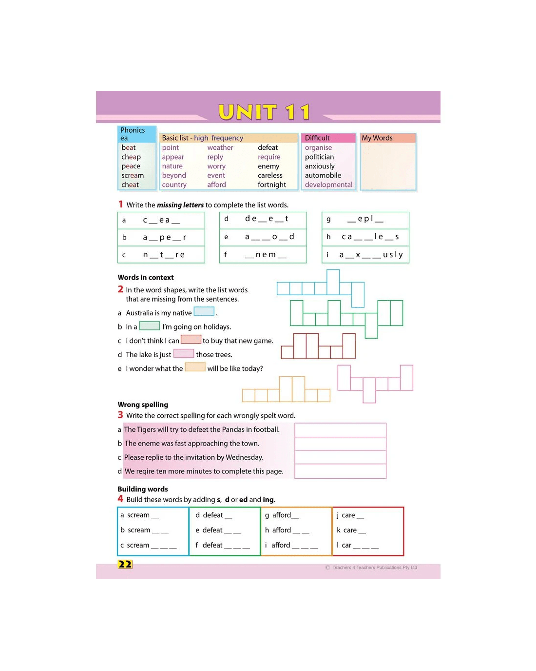 This Spelling Conventions Book is part of a series that is a continuum of structured curriculum-based learning from Foundation to Year 6. The spiralling program of developmental words, engaging activities, and games, combined with the easy allocation of specific ability groups, allows for all students to be catered for. The Difficult Words section and the My Words section also provide opportunities for extension within the class group.