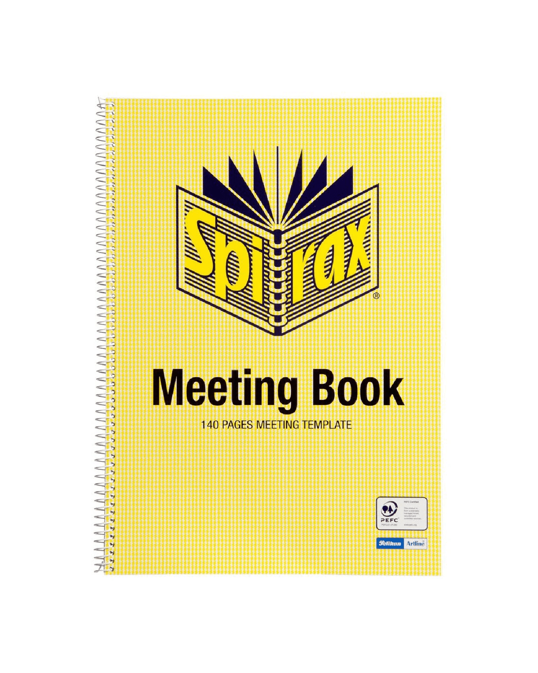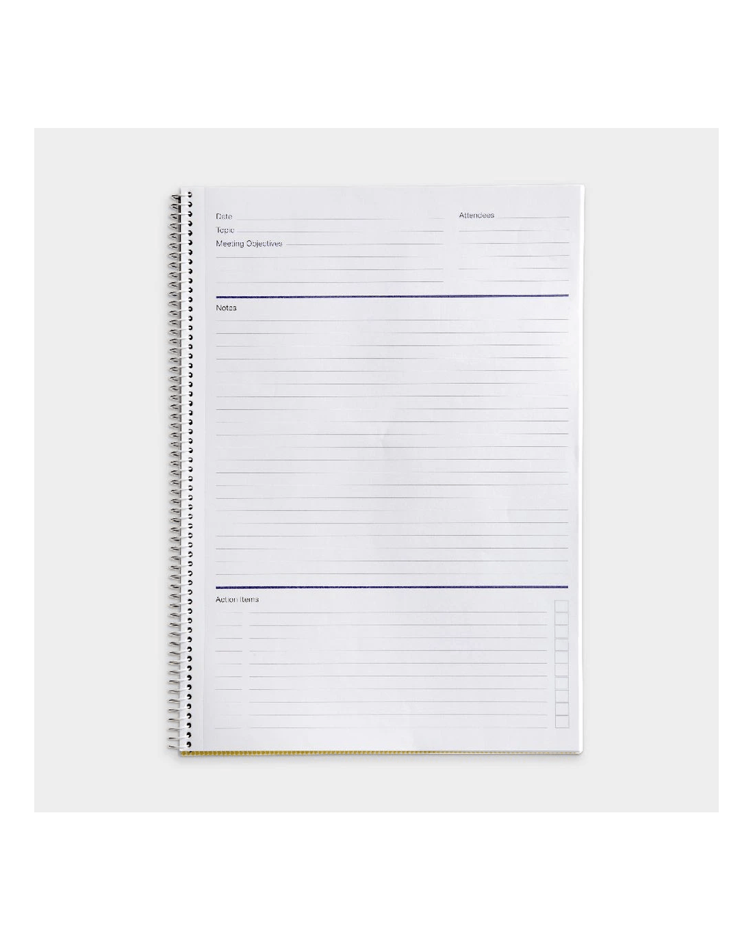 The Spirax Meeting Book has a template format that includes date, topic, attendees, objectives, notes and action for use during meetings. It features an elastic pen loop and removeable business card panel to keep your essential items handy. The pages are protected by a durable cardboard cover and are perforated for easy tear out.
