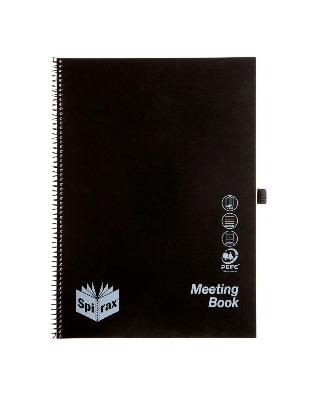 The Spirax Meeting Book has a template format that includes date, topic, attendees, objectives, notes and action for use during meetings. It features an elastic pen loop and removeable business card panel to keep your essential items handy. The pages are protected by a durable polypropylene cover and are perforated for easy tear out.