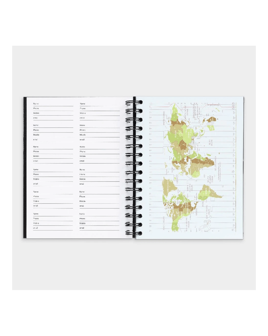 - It has contact pages and world time map for quick reference.
