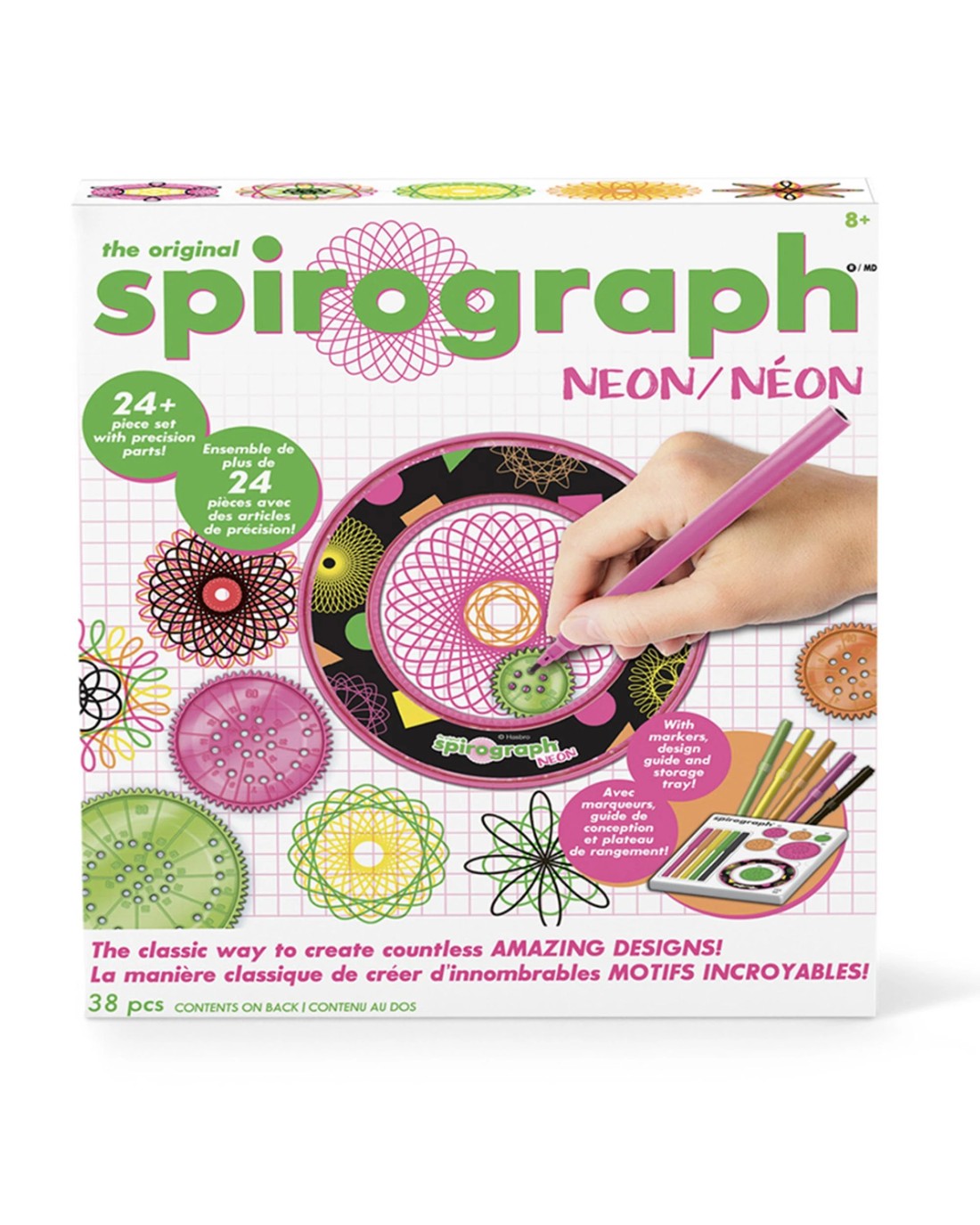 ince it was first introduced in 1965, Spirograph has made it possible for aspiring artists of all ages to create beautifully intricate designs. The distinctive wheels and rings of Spirograph have inspired and delighted generations of budding designers. This bright, fun Neon set includes 7 x precision Spiro wheels in varying sizes and dazzling colours, 5 x Neon art markers, 10 x sheets of design paper, a storage tray and 10 page design guidebook. Everything to bring out your vibrant creative flair! Ages: 8 +