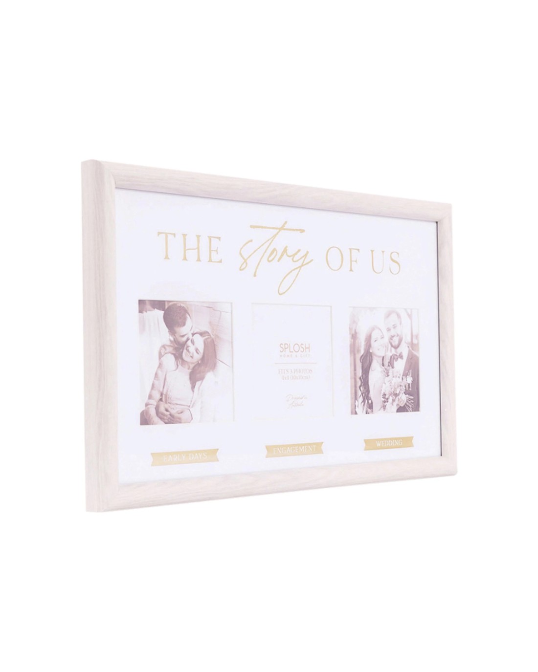 - Product Details: Three-slot metal photo frame to showcase "Story of us" which is printed in gold.