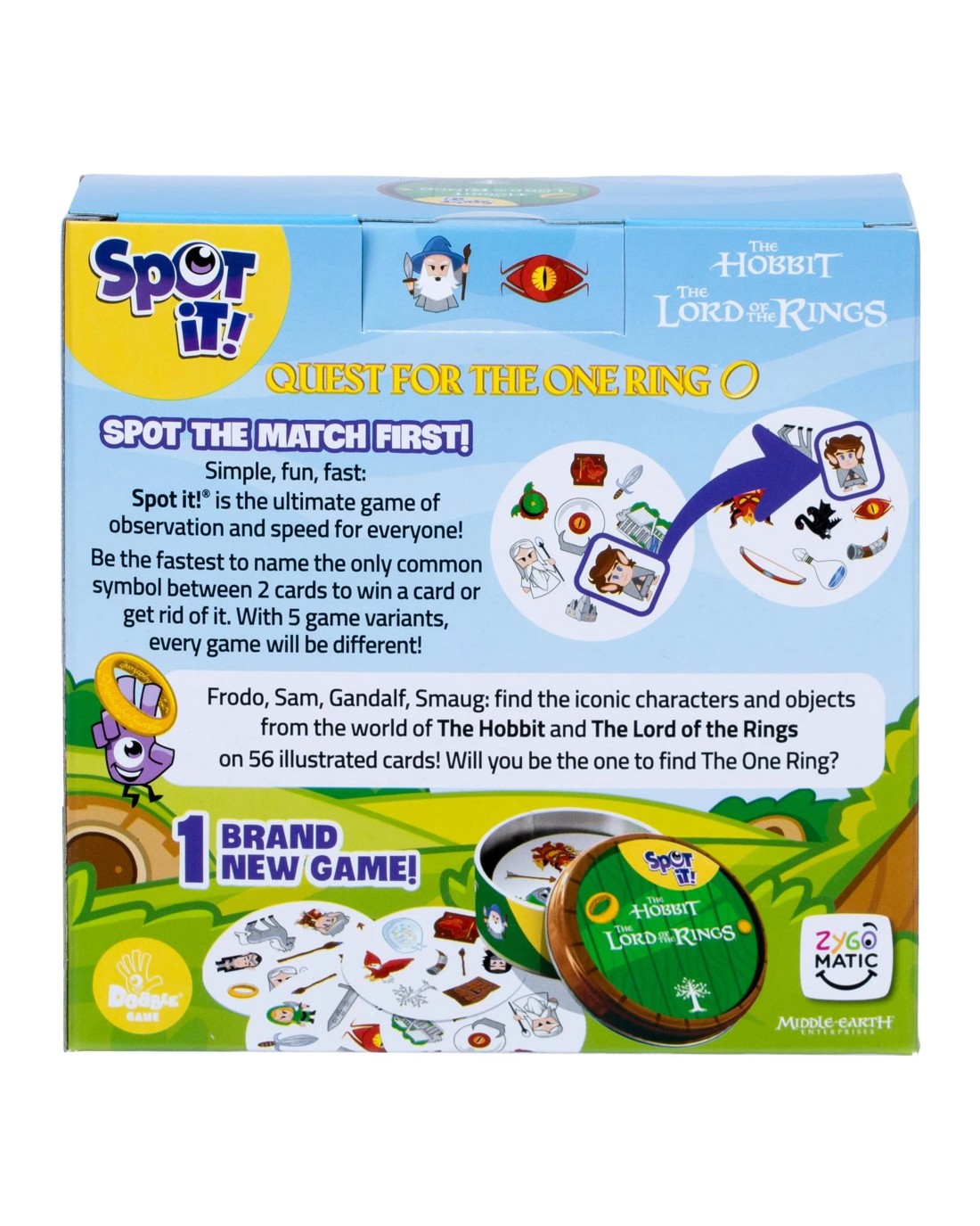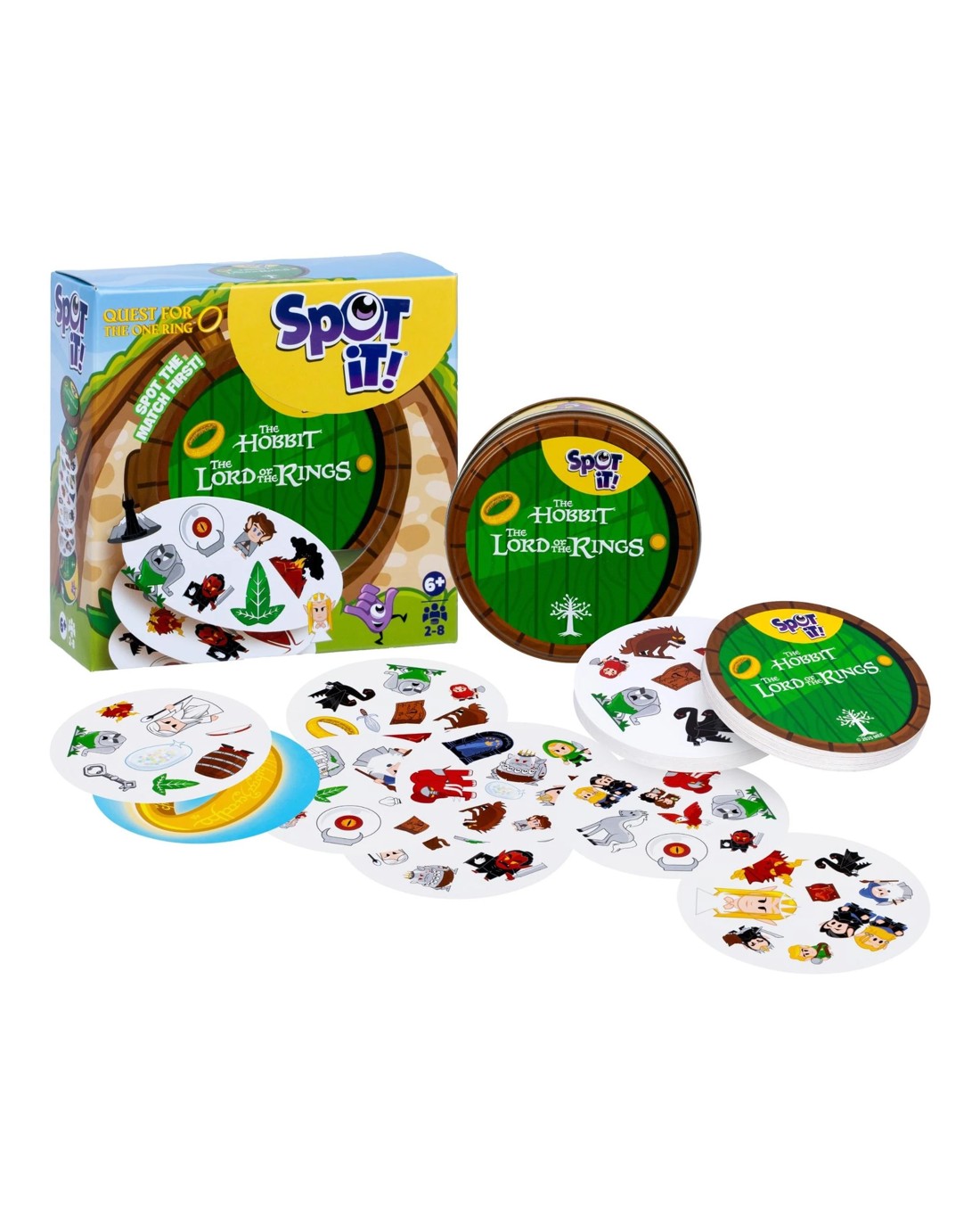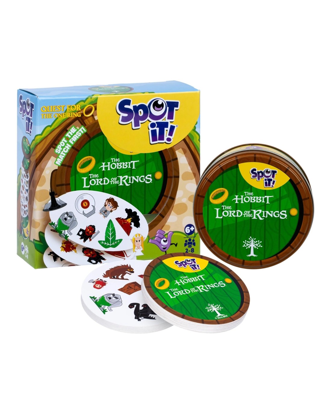 Spot it! The Lord of the Rings features gameplay nearly identical to that of Spot it! Spot the match first! Simple, fun, fast: Spot It! is the ultimate game of observation and speed for everyone! Be the fastest to name the only common symbol between 2 cards to win a card or get rid of it. With 5 game variants (including 1 brand-new game), every game will be different! Nearly every card features eight different symbols, with the symbols varying in size from one card to the next. Any two cards have exactly one symbol in common. For the basic Spot it! game, reveal one card, then another. Whoever spots the symbol in common on both cards claims the first card, then another card is revealed for players to search, and so on. Whoever has collected the most cards when the 55-card deck runs out wins! How Spot it! The Lord of the Rings differs from Spot it! is that includes a 56th card: the One Ring. Frodo, Sam, Gandalf, Smaug: find the iconic characters and objects from the world of The Hobbit and The Lord of the Rings on 56 illustrated cards! Will you be able to find The One Ring? Ages: 6 + | Players: 2 - 8