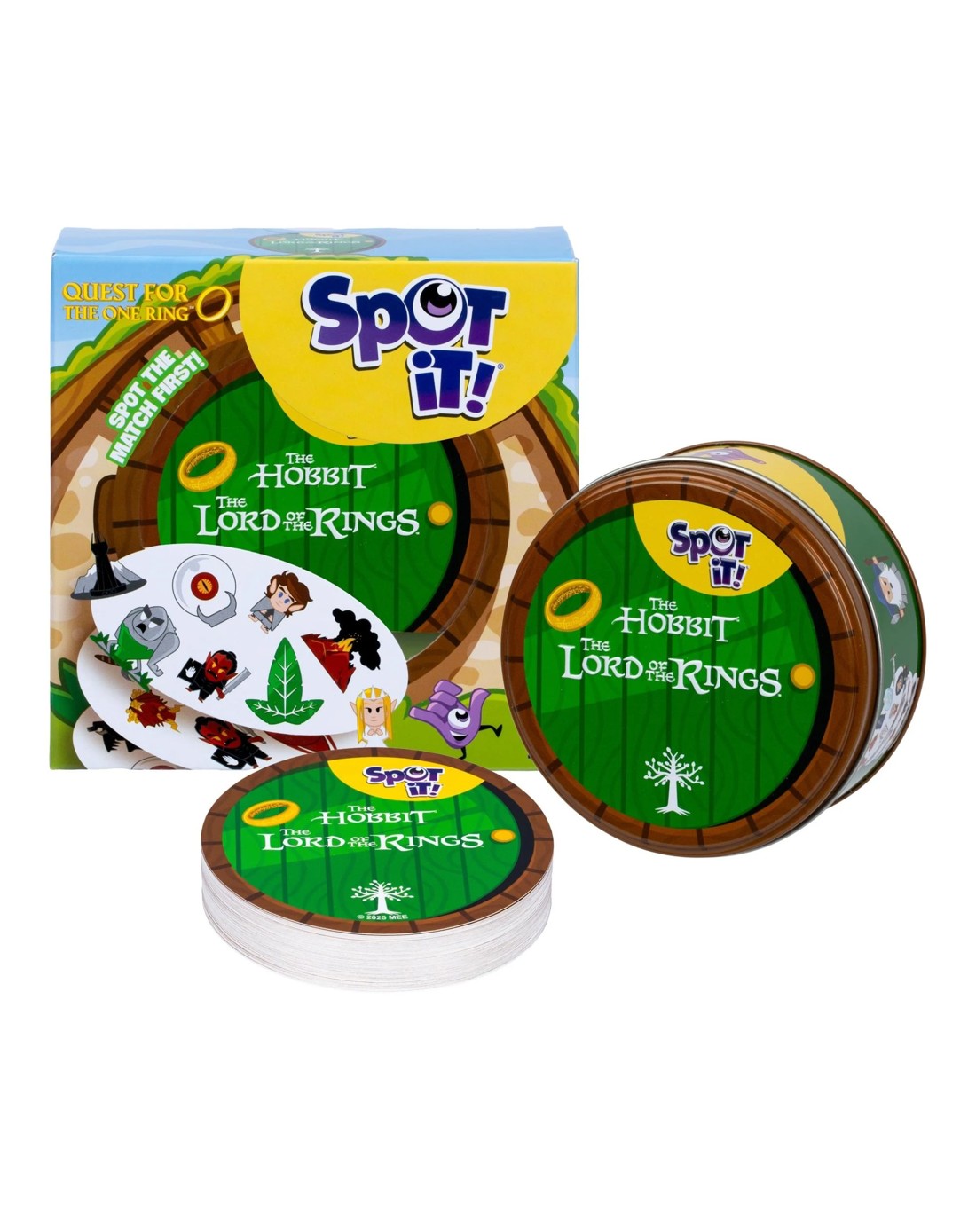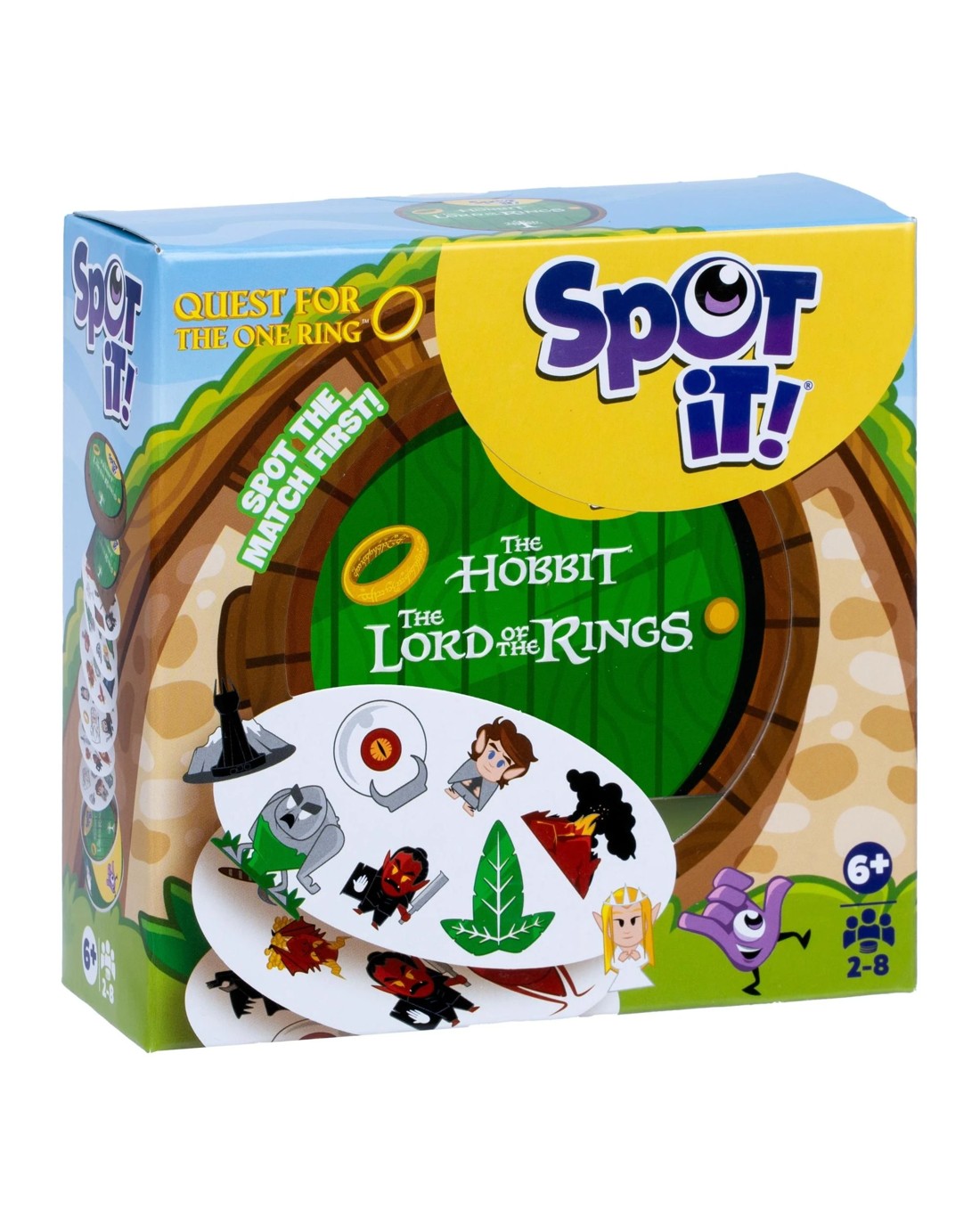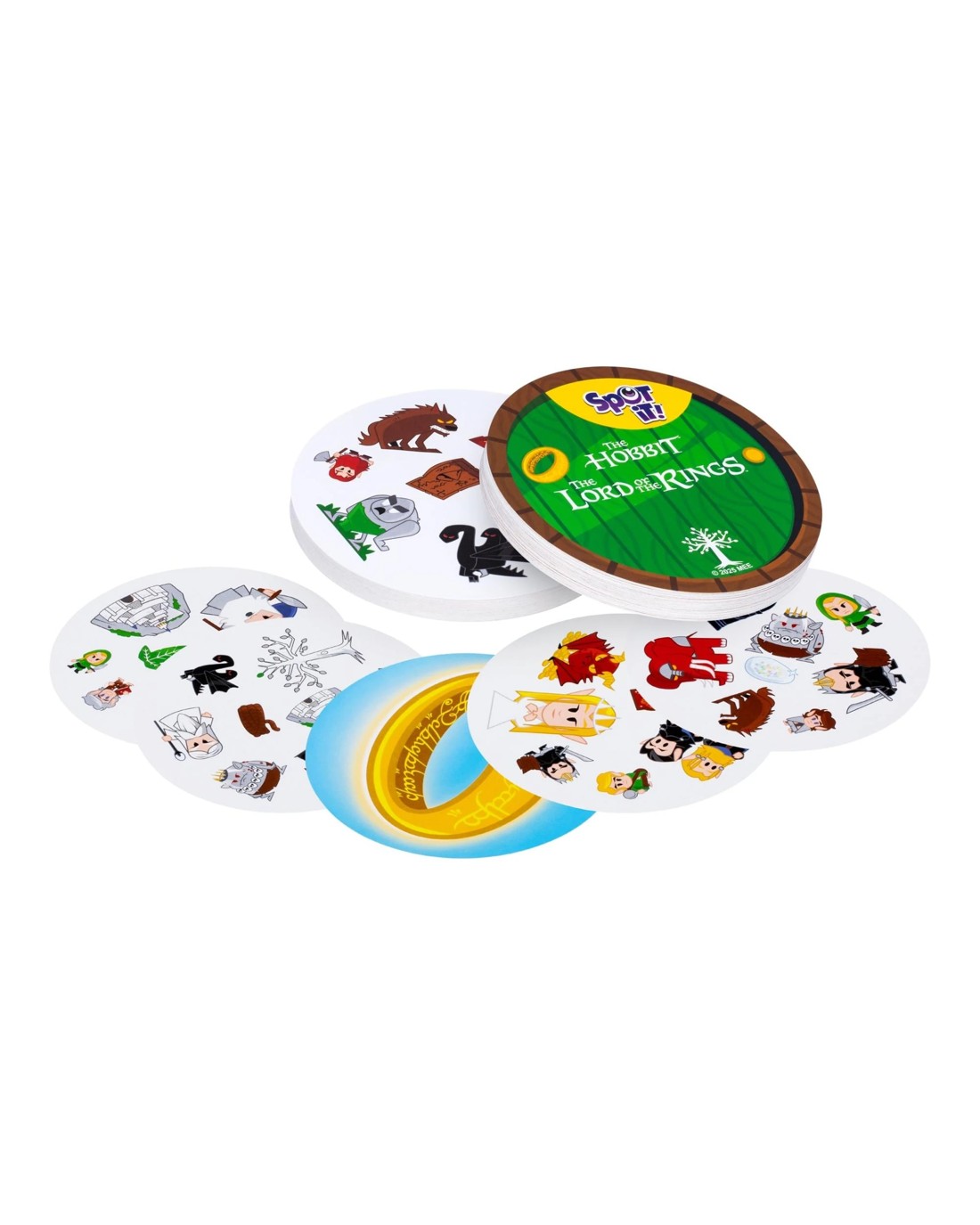 Spot it! The Lord of the Rings features gameplay nearly identical to that of Spot it! Spot the match first! Simple, fun, fast: Spot It! is the ultimate game of observation and speed for everyone! Be the fastest to name the only common symbol between 2 cards to win a card or get rid of it. With 5 game variants (including 1 brand-new game), every game will be different! Nearly every card features eight different symbols, with the symbols varying in size from one card to the next. Any two cards have exactly one symbol in common. For the basic Spot it! game, reveal one card, then another. Whoever spots the symbol in common on both cards claims the first card, then another card is revealed for players to search, and so on. Whoever has collected the most cards when the 55-card deck runs out wins! How Spot it! The Lord of the Rings differs from Spot it! is that includes a 56th card: the One Ring. Frodo, Sam, Gandalf, Smaug: find the iconic characters and objects from the world of The Hobbit and The Lord of the Rings on 56 illustrated cards! Will you be able to find The One Ring? Ages: 6 + | Players: 2 - 8
