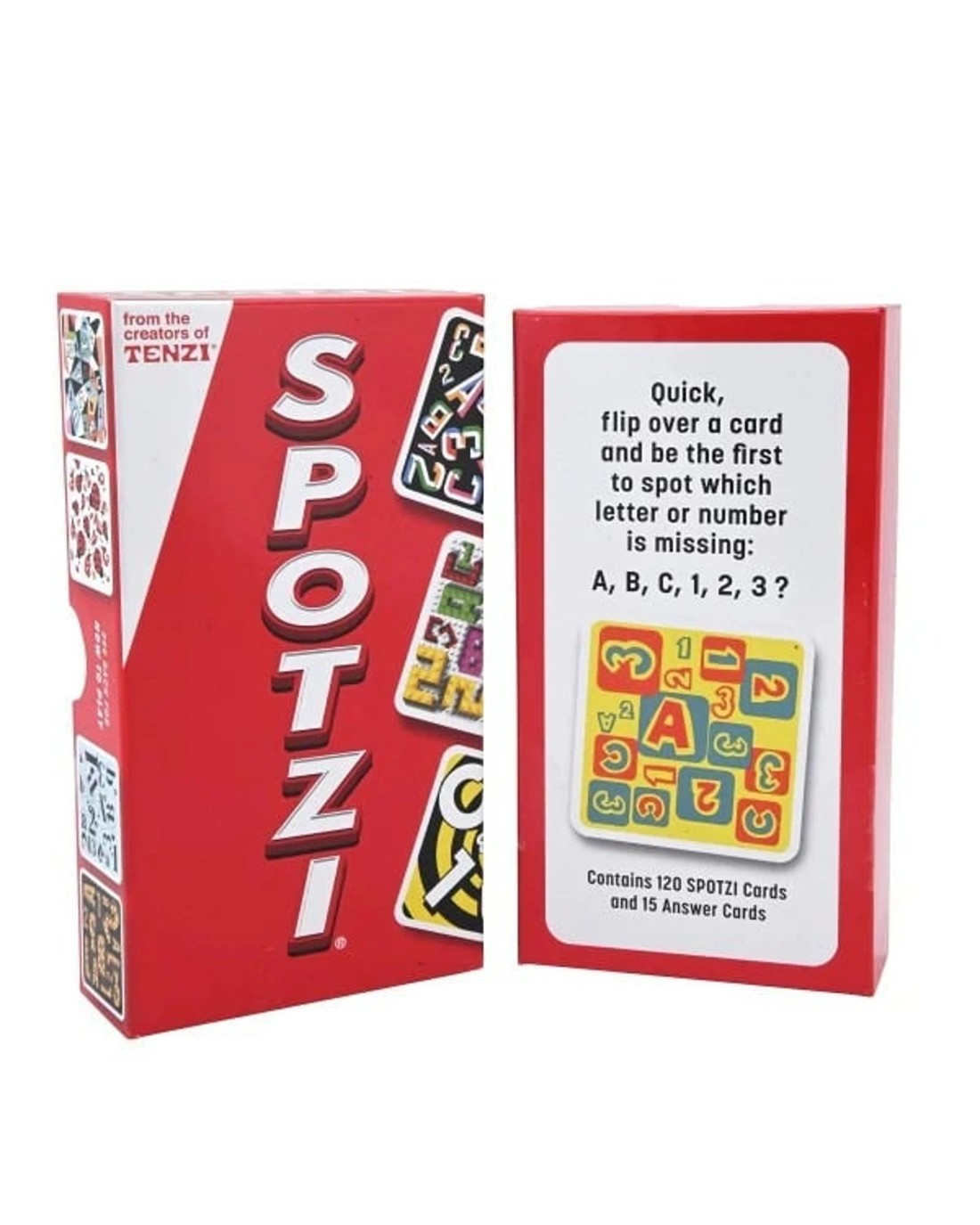 Spotzi from the creators of Tenzi. Quick, flip over a card and be the first to spot which letter or number is missing: A, B, C, 1, 2, 3?? Ages: 6 + | Players: 2 - 5