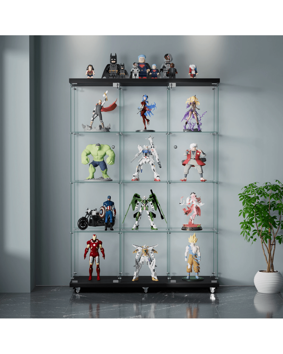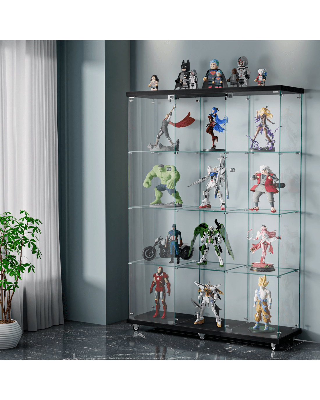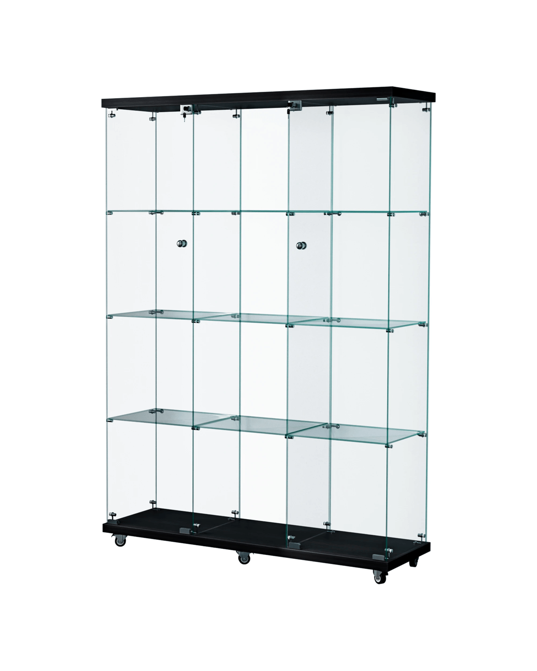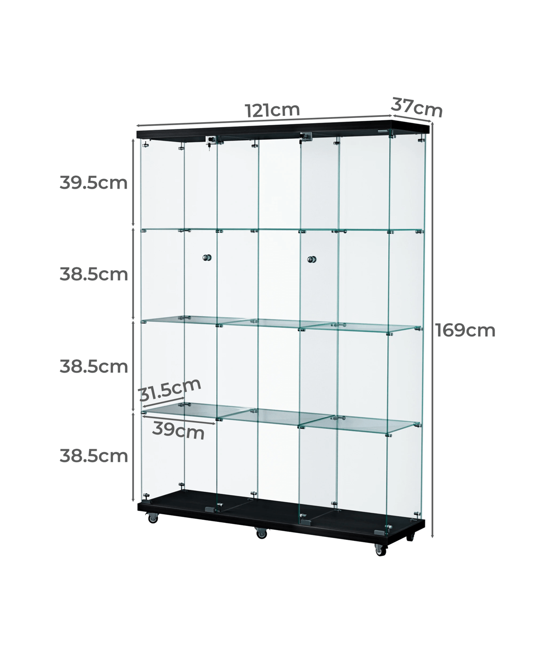Perfect for retail environments, home collections, or office displays, this versatile cabinet rises to any occasion. The four-tier design maximises vertical space, while the high-capacity shelving system accommodates various item sizes and weights. Its practical features, including a secure lock system and smooth-rolling wheels, make it an ideal choice for both static displays and dynamic retail environments.