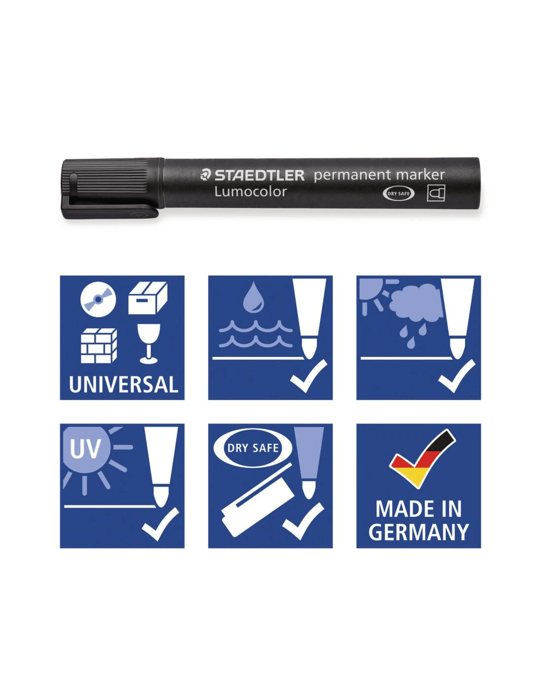 Staedtler Lumocolor 352 Permanent Markers deliver lightfast, smudge proof and water proof markings on most surfaces. They contain Dry Safe ink which won't dry out if you accidentally leave the cap off your marker.