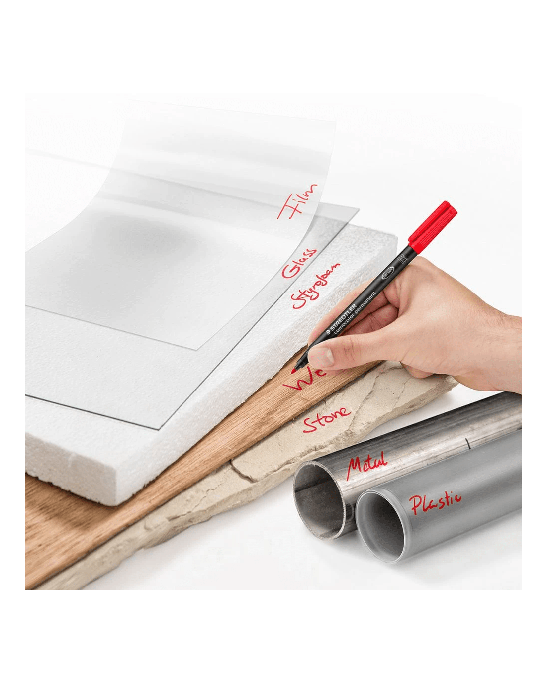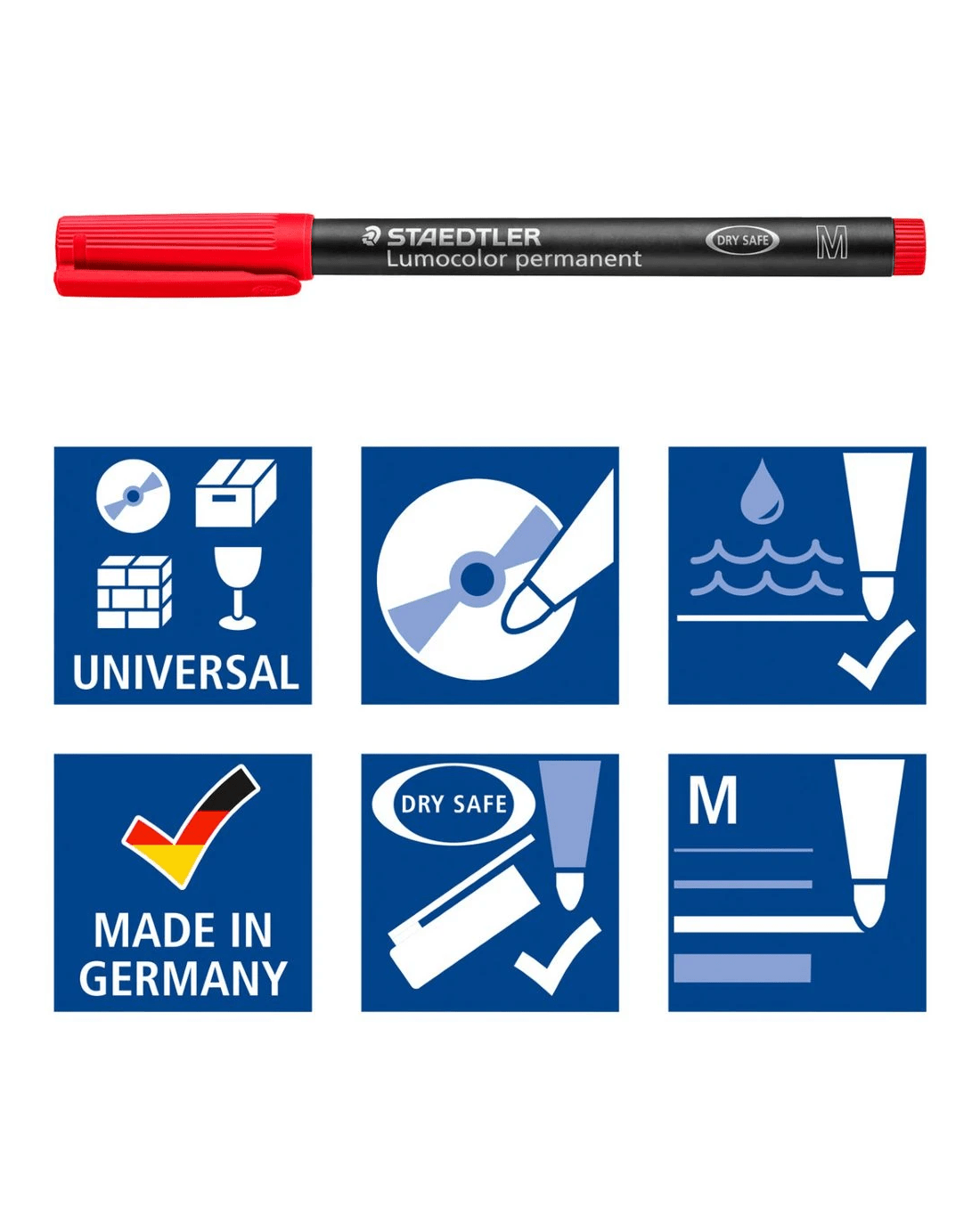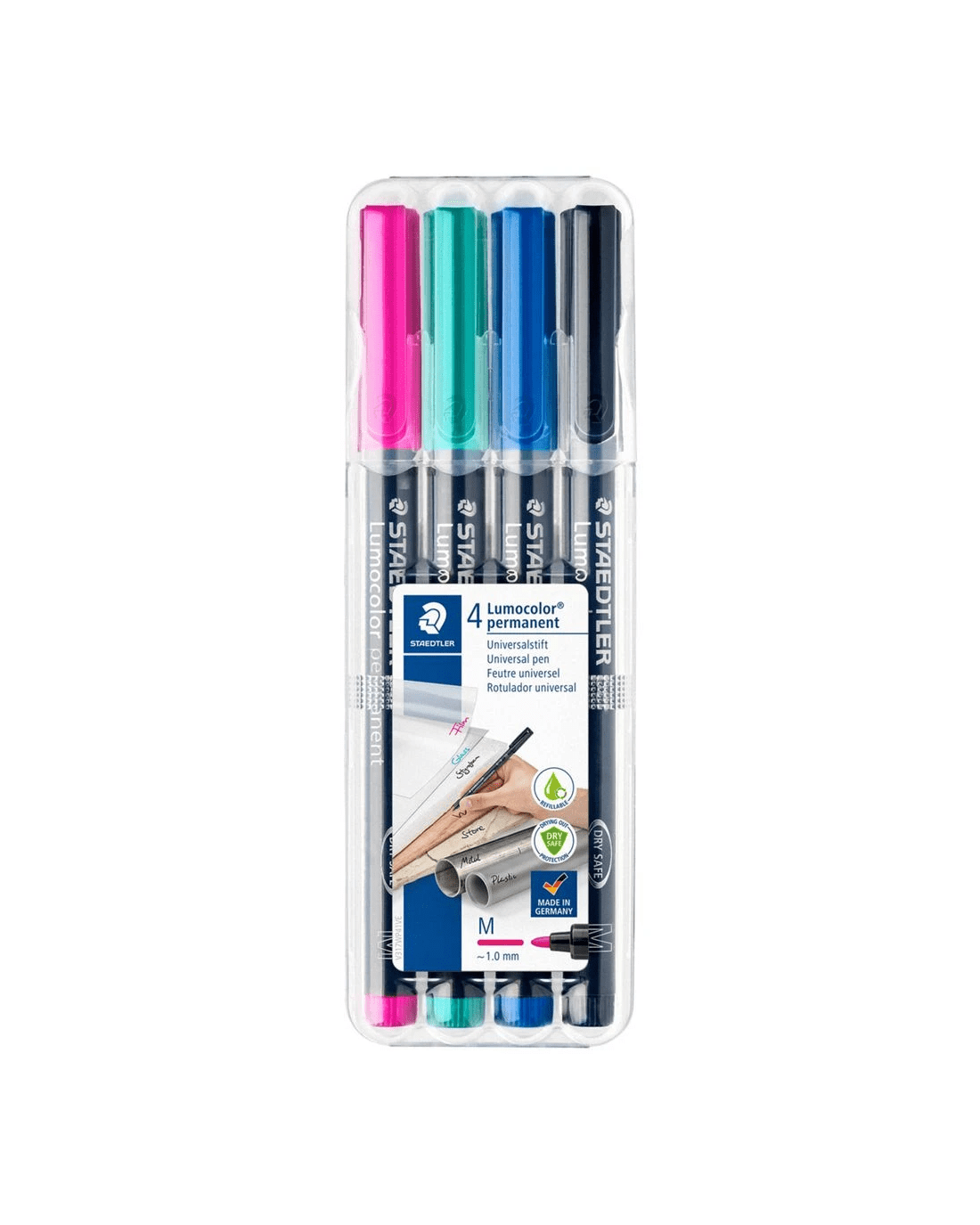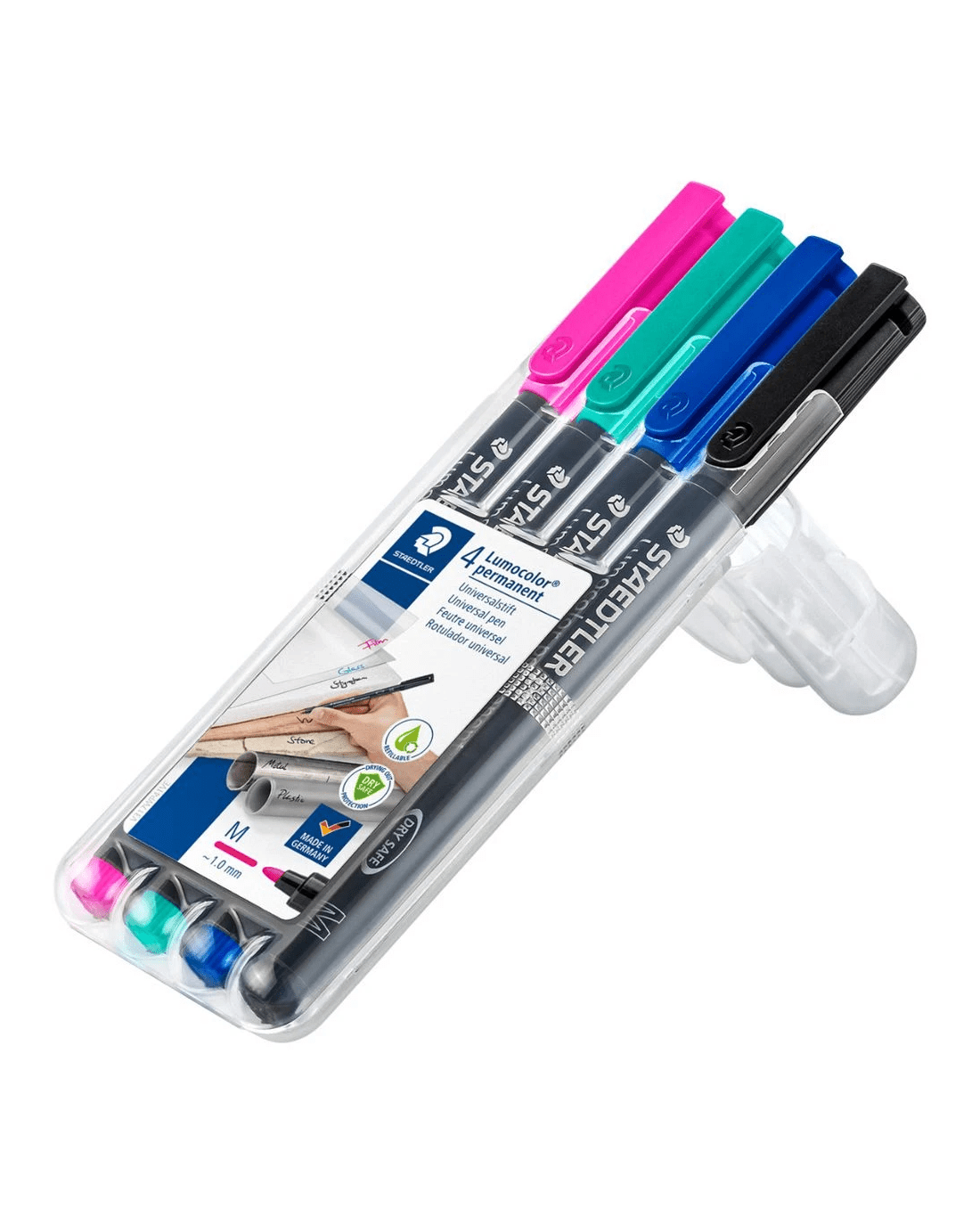 The Staedtler Lumocolor Permanent Pen is designed for versatile use on surfaces like wood, plastic, fabric, CDs, DVDs, and more. Featuring quick-drying, low-odour ink that is waterproof and smudge-resistant, these pens deliver bright, brilliant colours every time. With airplane-safe pressure equalisation and DRY-SAFE technology, they can be left uncapped for days without drying out.